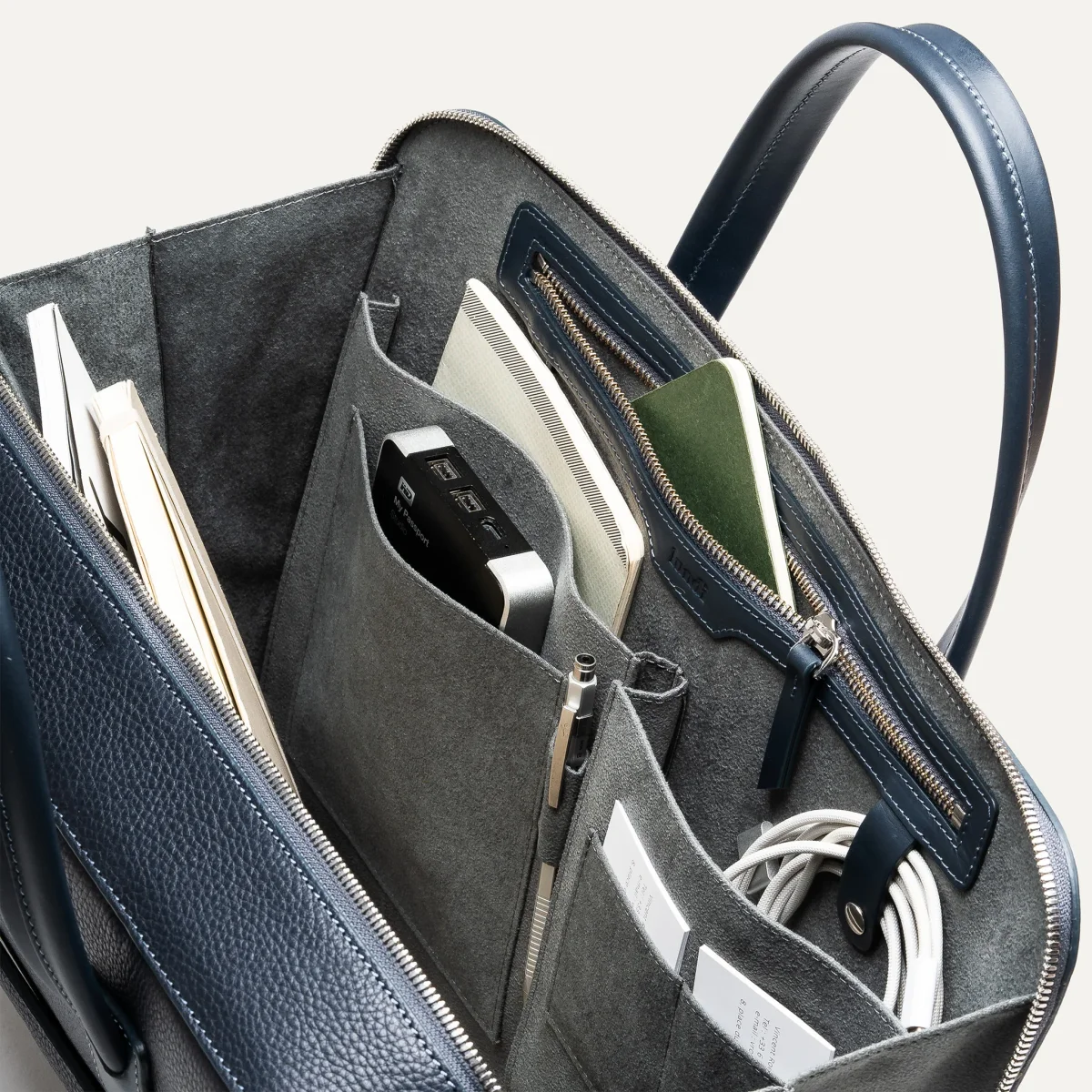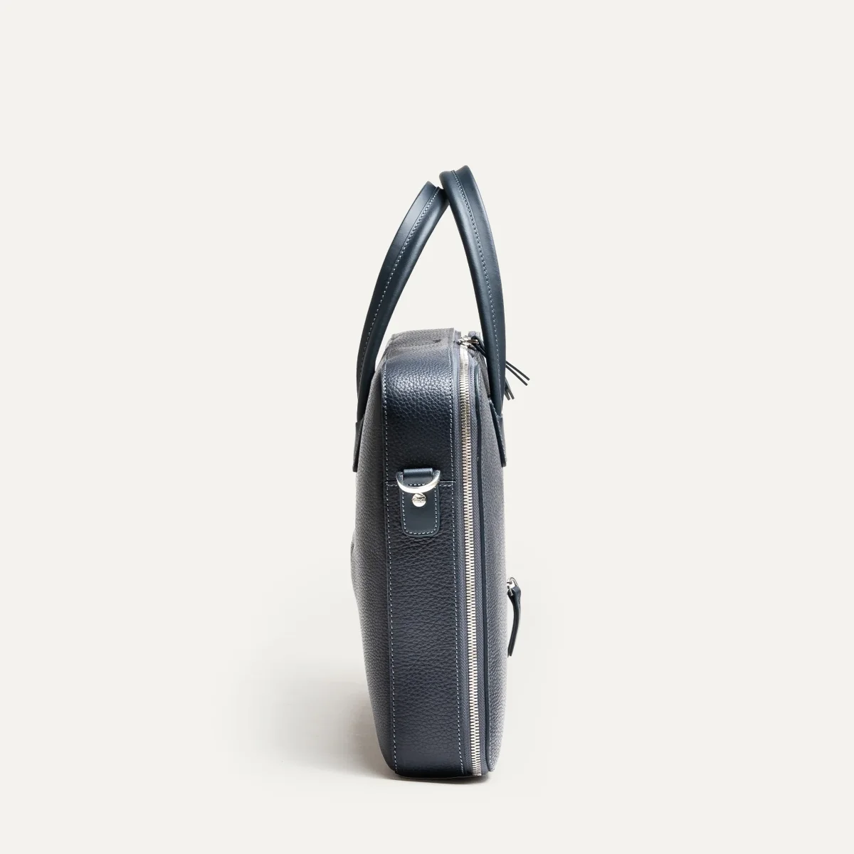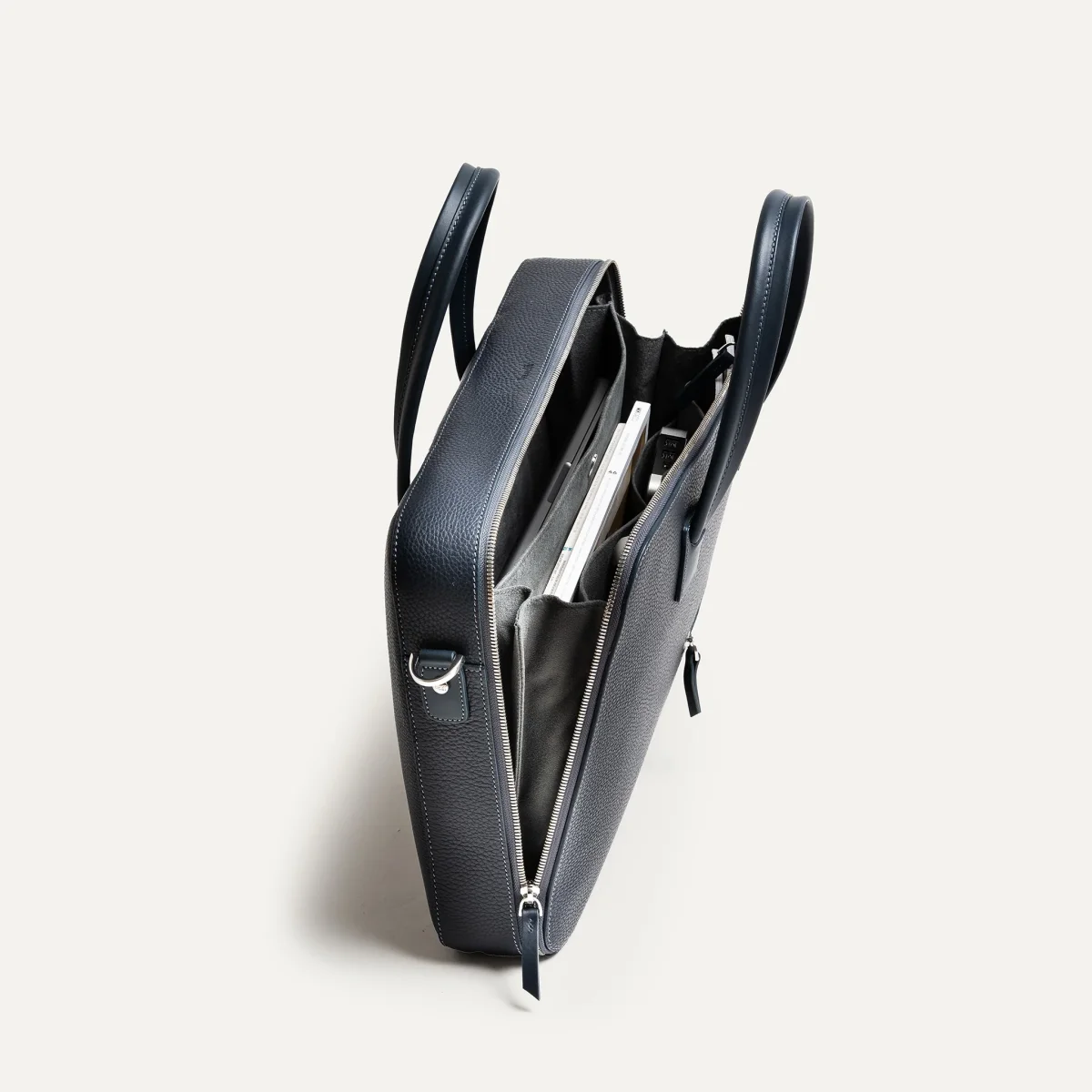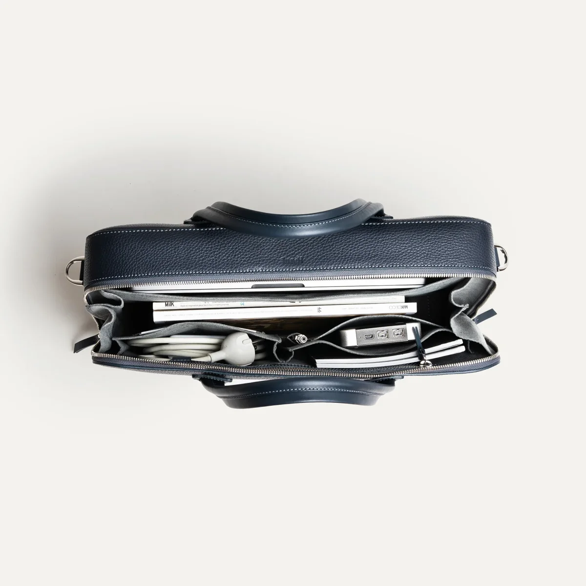 Confectionné en cuir pleine fleur grainé, le porte-documents OSCAR dans sa version bleu marine redéfinit les standards du sac business contemporain. Grâce à un tannage végétal, ce sac conjugue durabilité, souplesse et engagement environnemental.