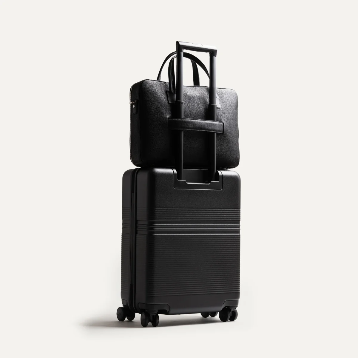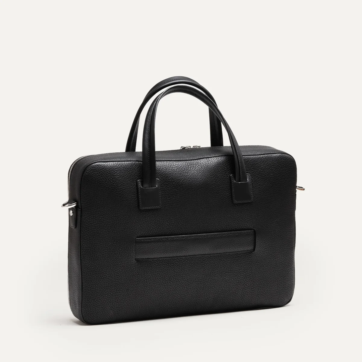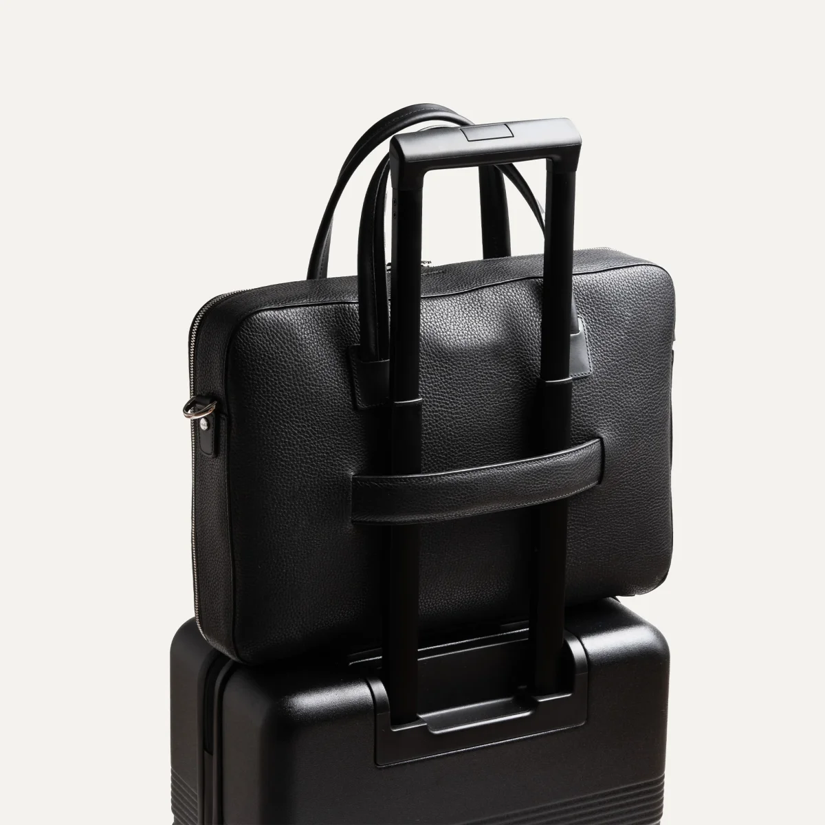 Au dos, une attache valise en cuir, soutenue par des élastiques internes, assure une fixation confortable et sécurisée sur votre trolley lors de vos déplacements professionnels.