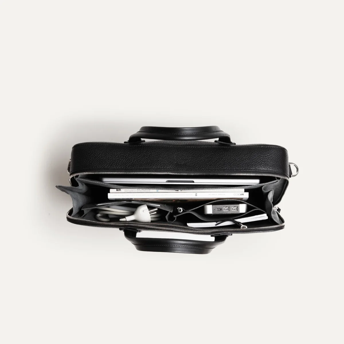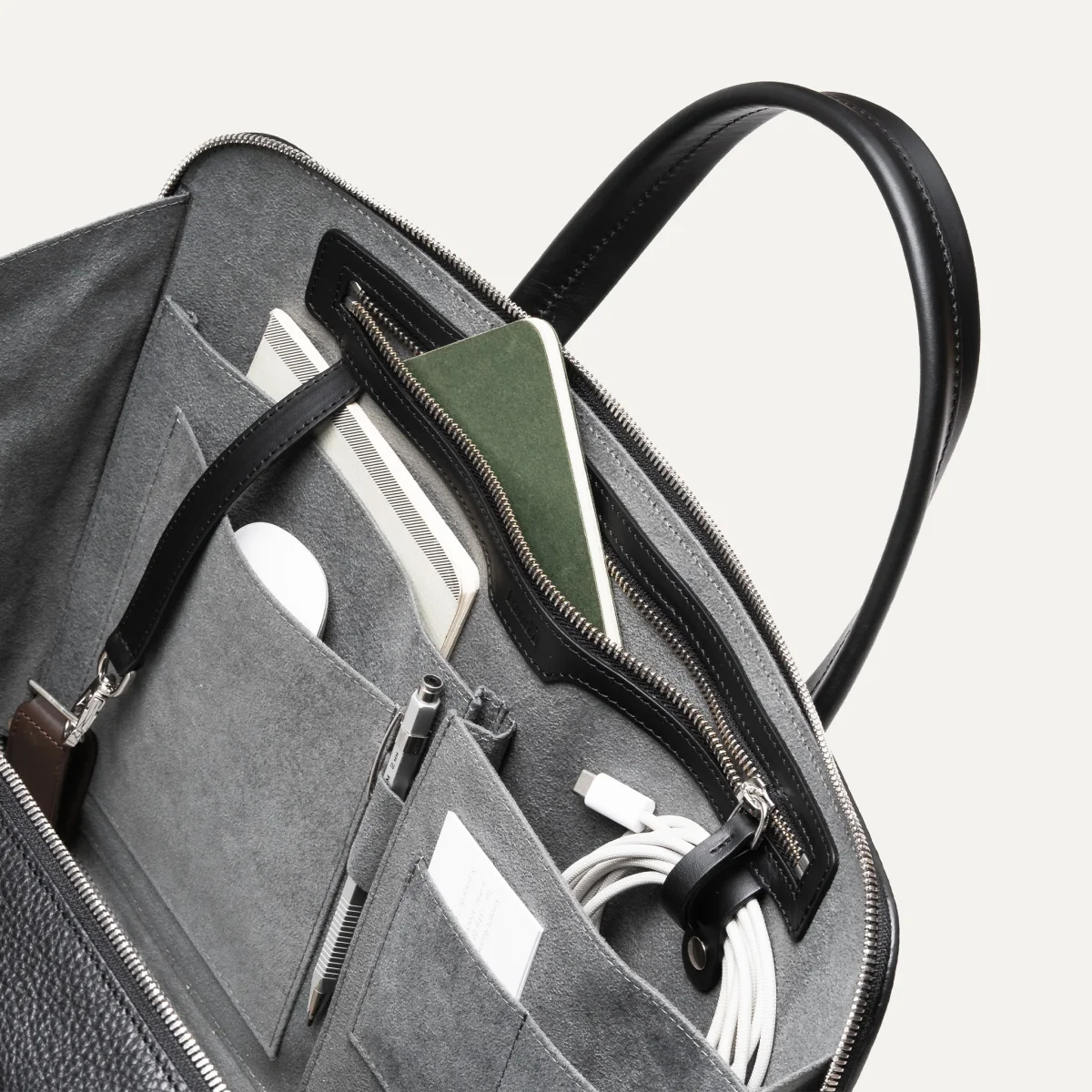 Sa poche ordinateur est dimensionnée pour loger un appareil jusqu’à 17 pouces, vous permettant d’emporter l’essentiel dans un format sobre et structuré.