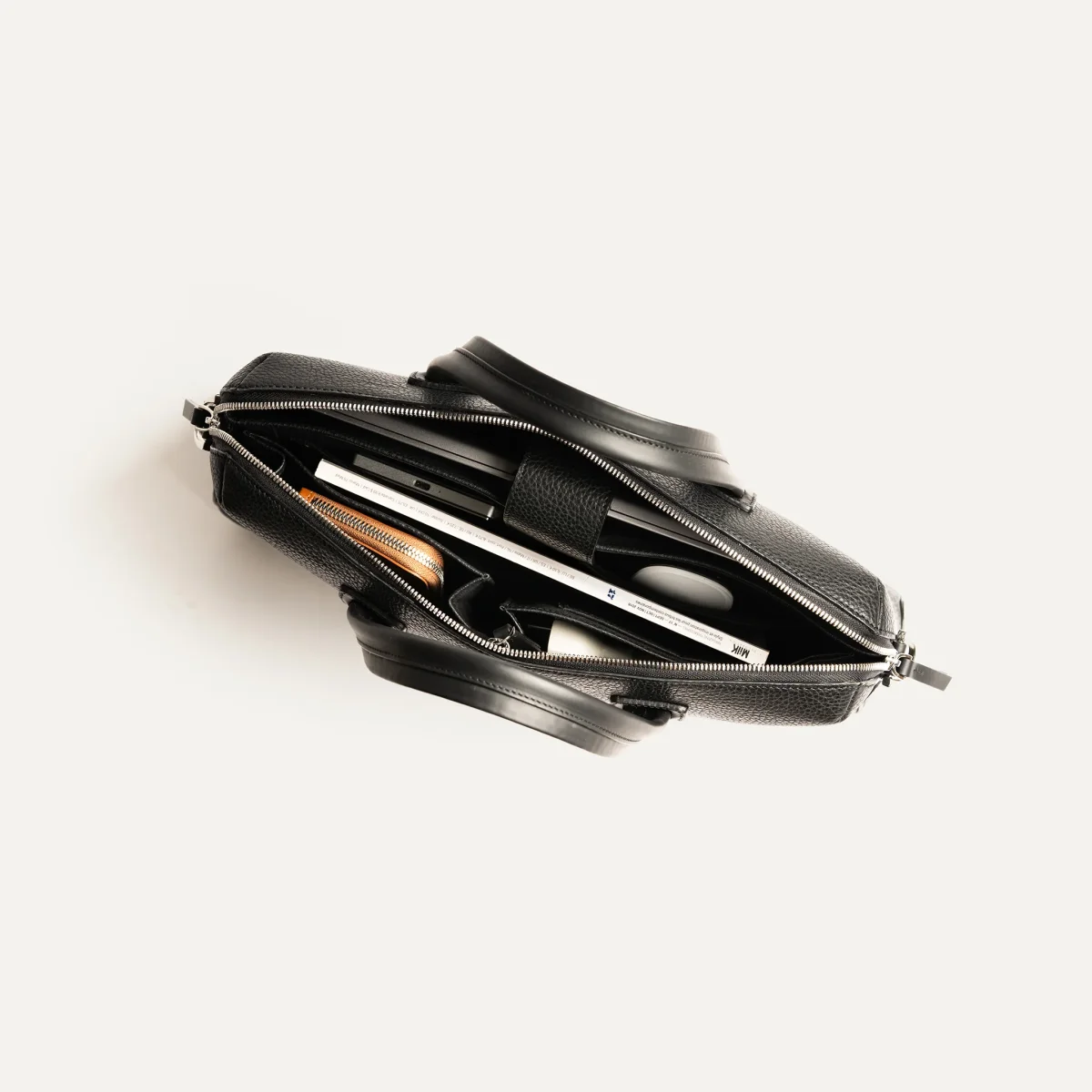 Malgré sa taille compacte, ce sac propose une organisation intérieure efficace pour accueillir tous vos indispensables : ordinateur portable, câbles, chargeur, documents, et plus encore.