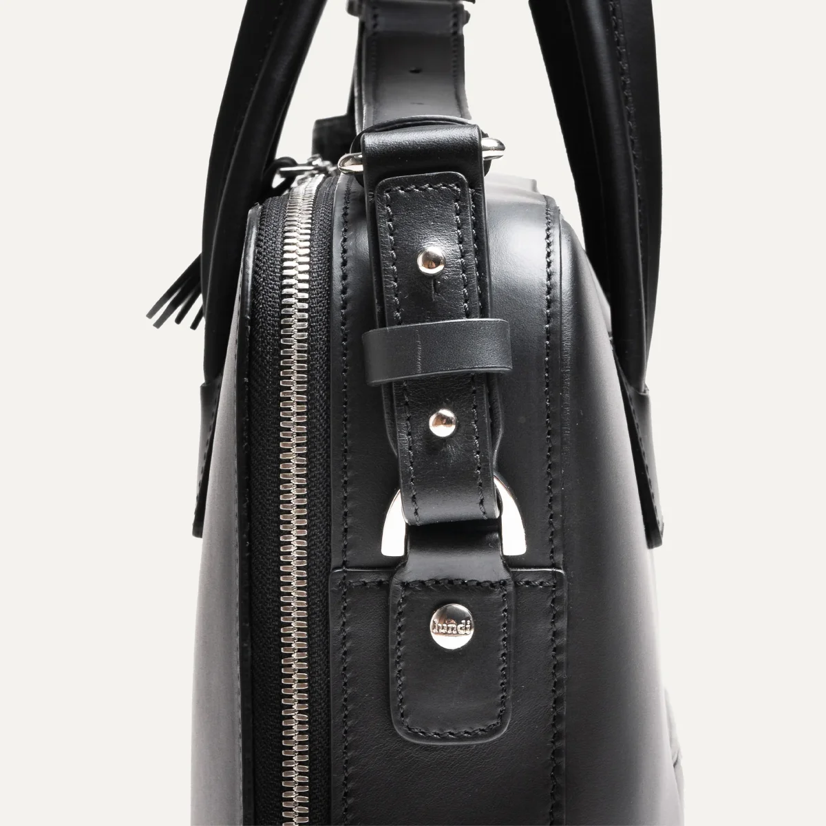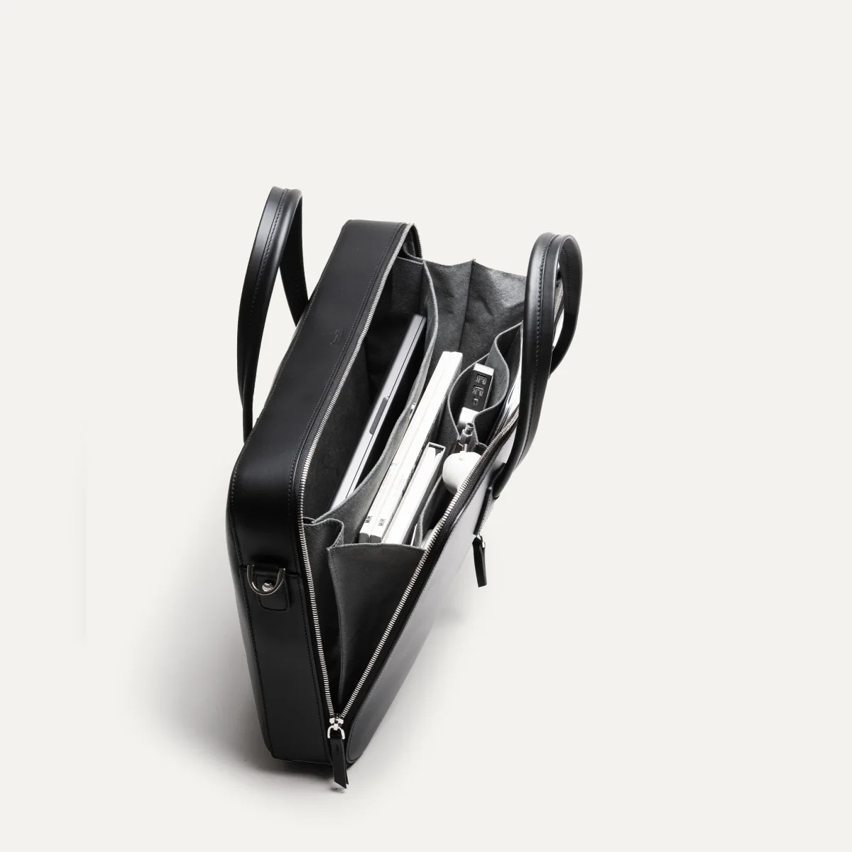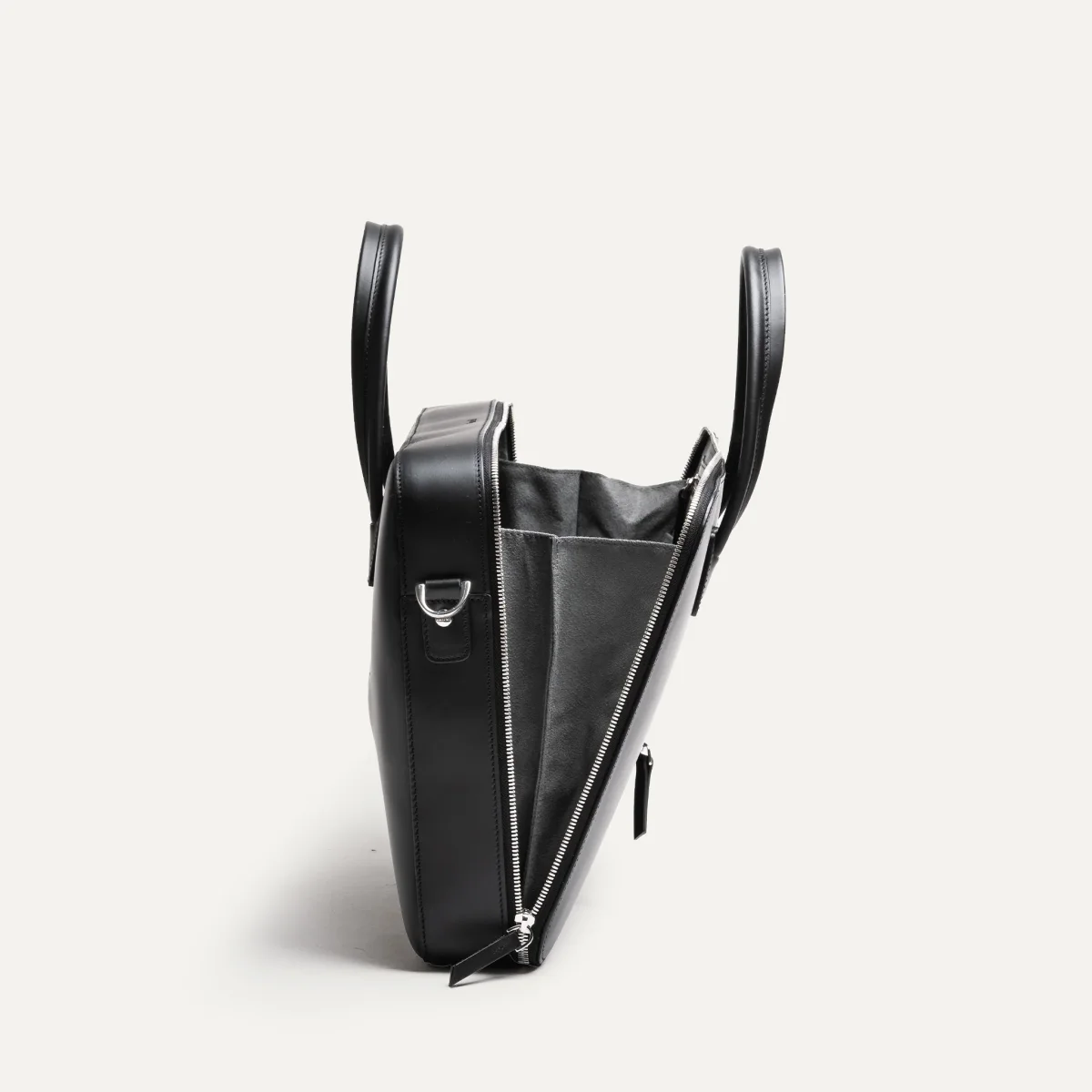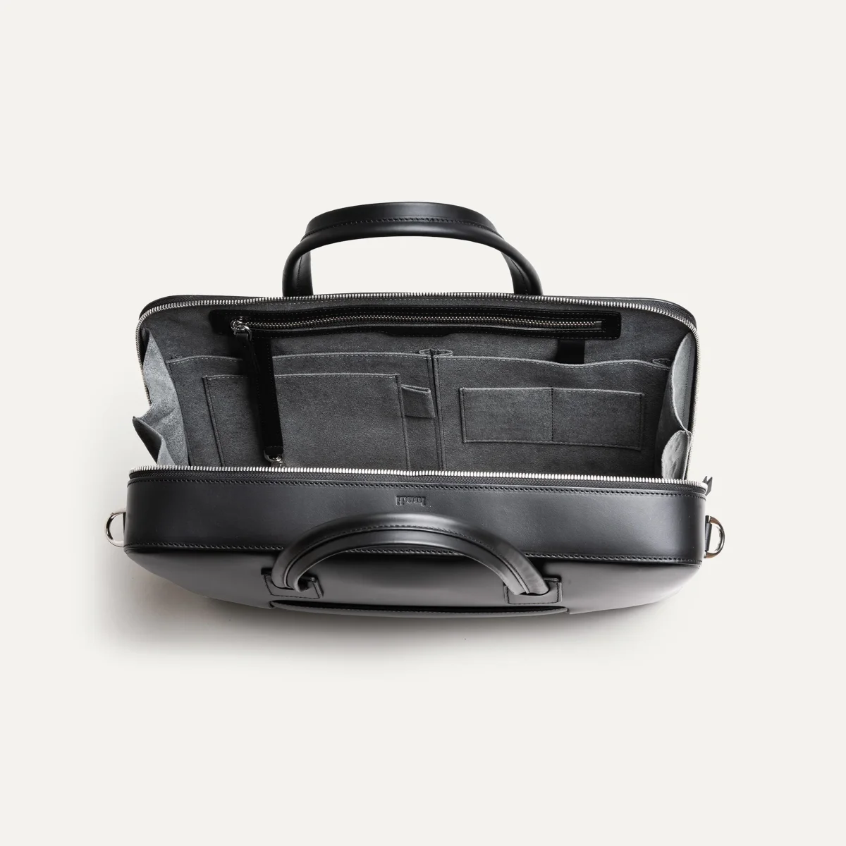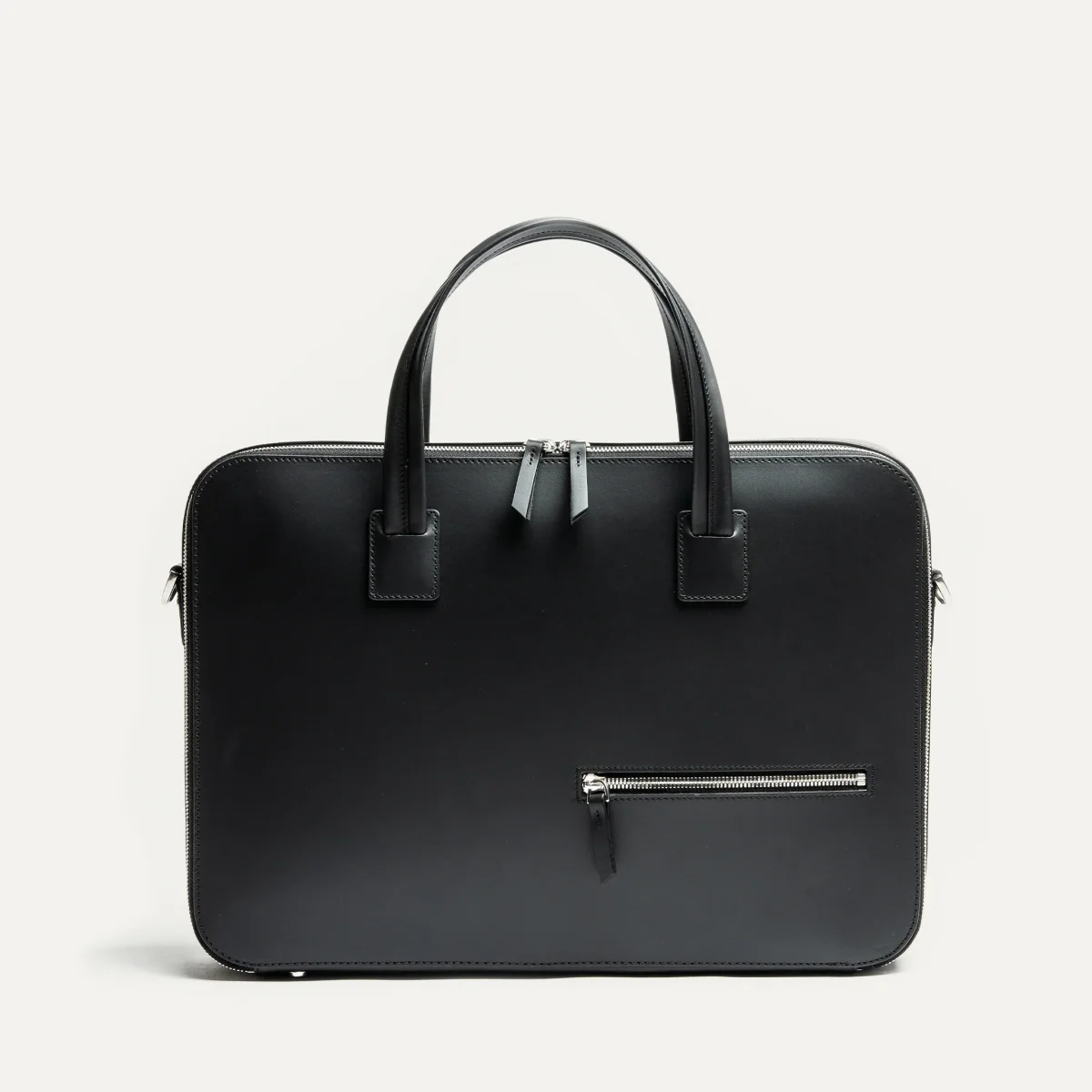 Nous souhaitions un noir mat pour ce briefcase ALESSANDRO. Il est confectionné dans notre cuir lisse pleine fleur, issu d’un tannage végétal qui respecte l’environnement tout en assurant une patine naturelle au fil du temps. Un cuir dense et noble, pensé pour vous accompagner pendant de longues années.