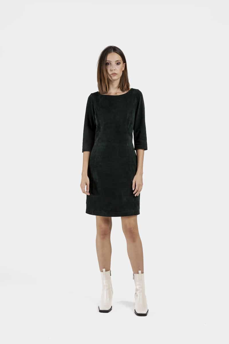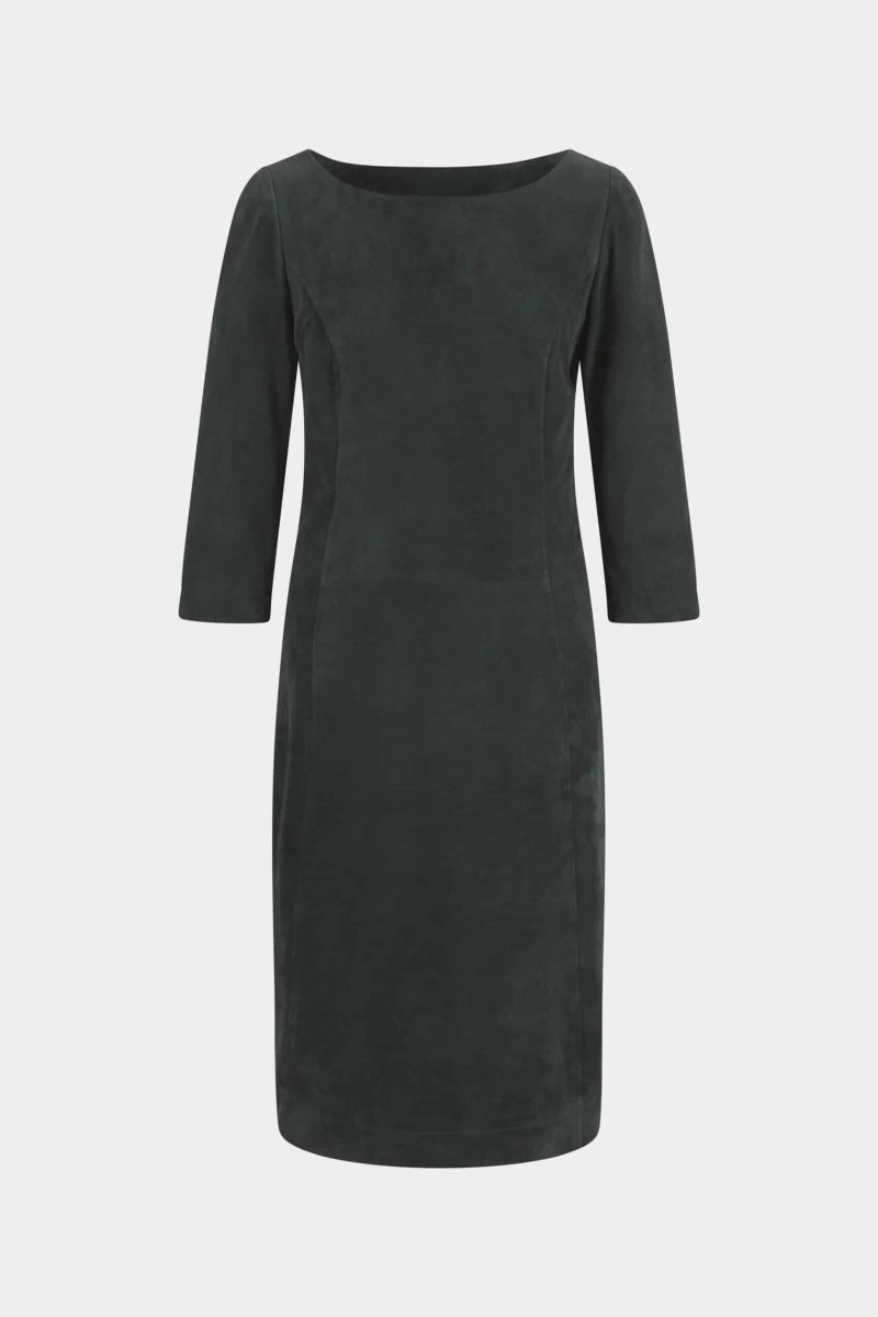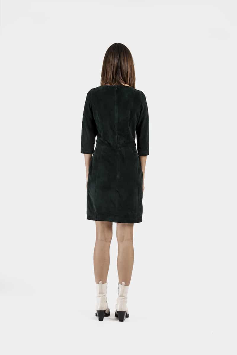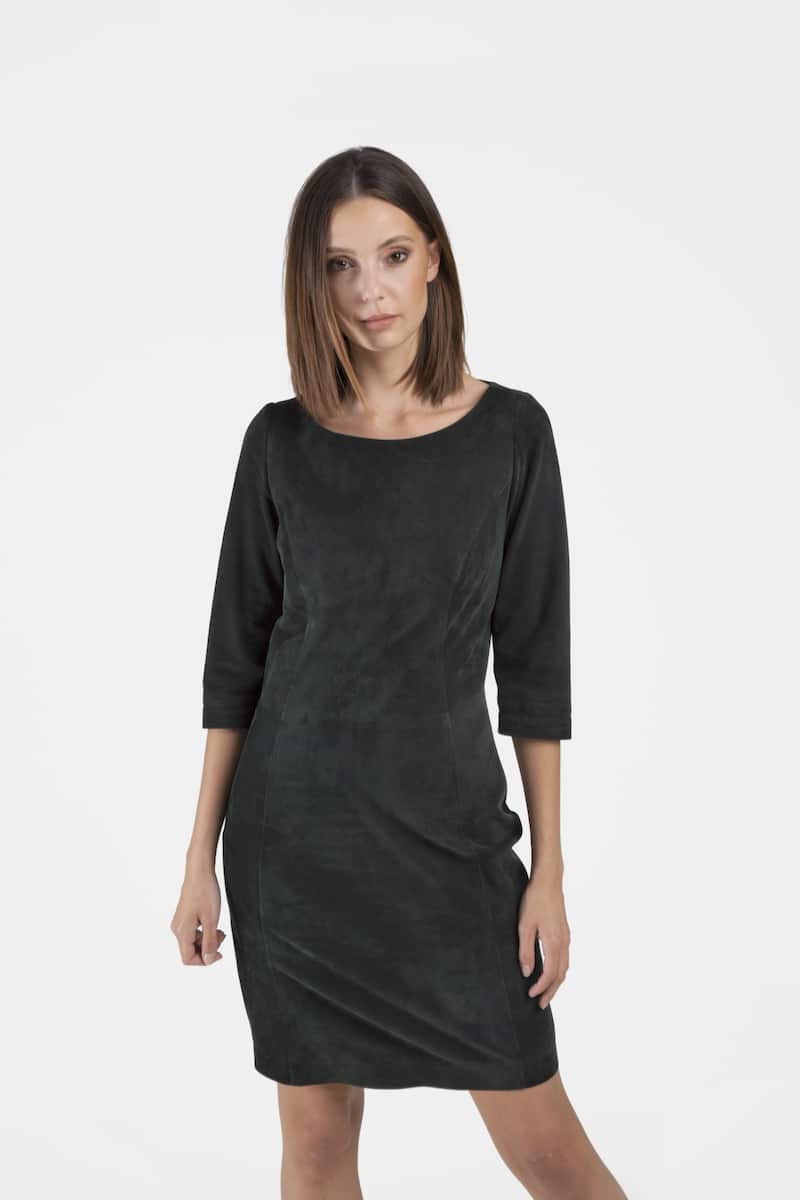 Cette robe cintrée couleur vert intense en daim chèvre velours stretch et non doublée offre un look féminin et présente un col rond échancré, des manches ¾ et une fermeture éclair invisible dans le dos.