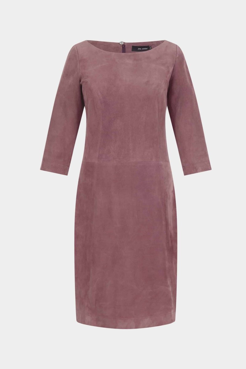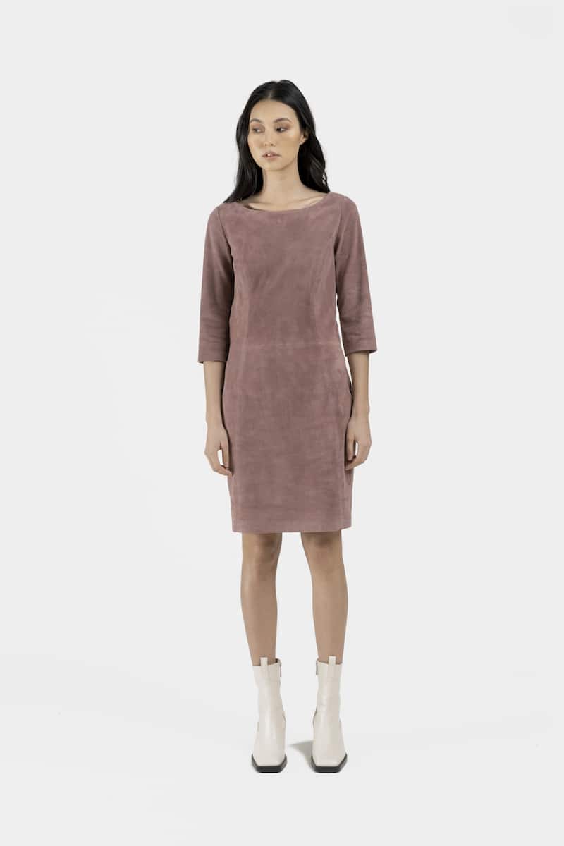 Cette robe cintrée couleur rose en daim chèvre velours stretch et non doublée offre un look féminin et présente des manches ¾ et une fermeture éclaire invisible dans le dos.