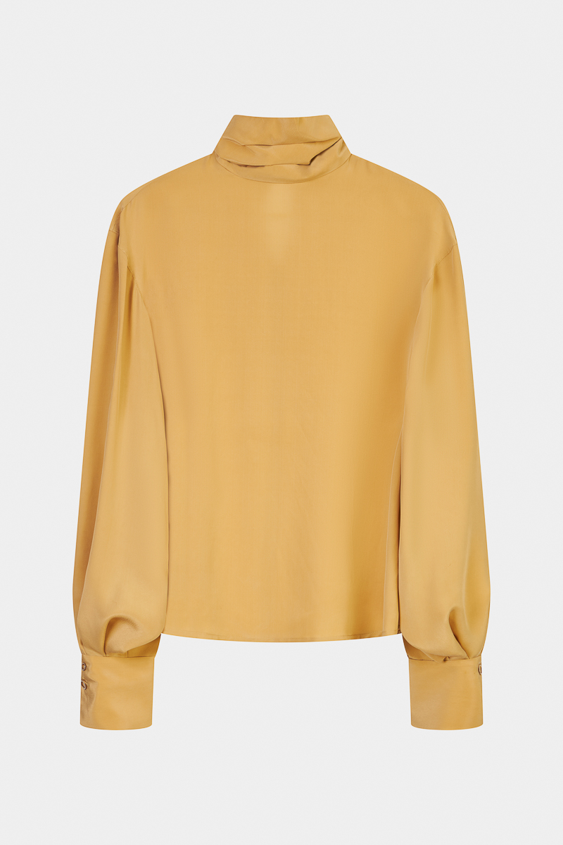Chemisier en soie col montant plissé, sophistiqué et intemporel, qui allie douceur de la soie et élégance discrète.