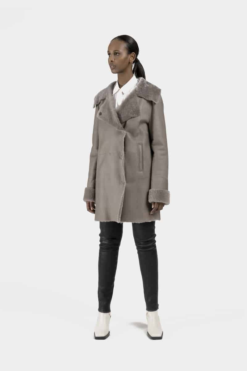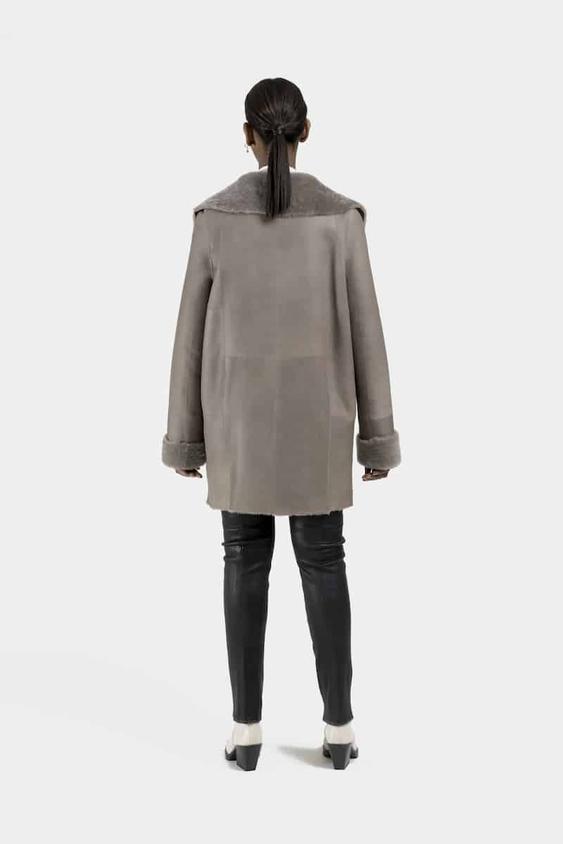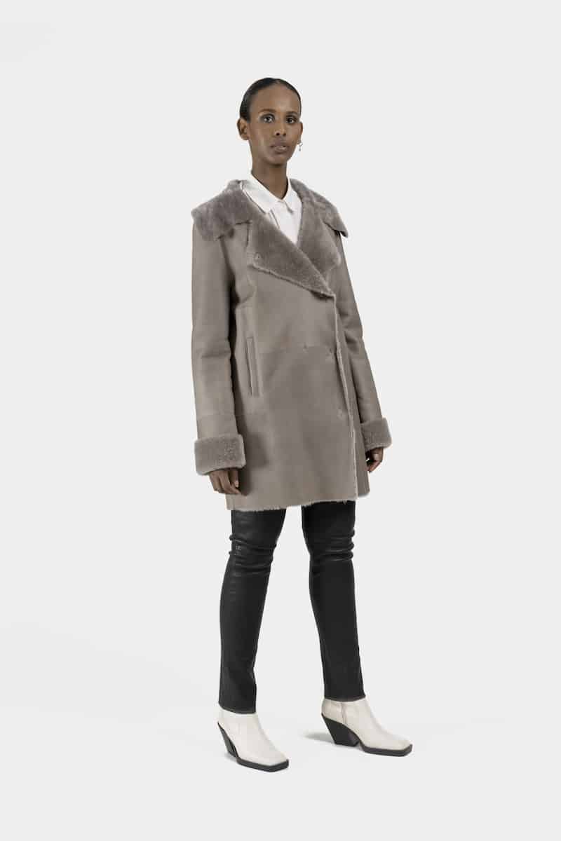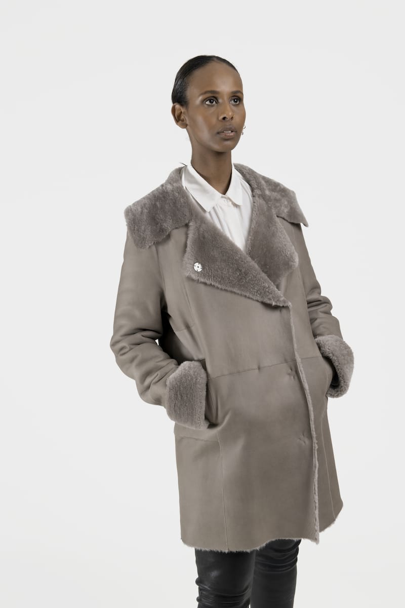 Surmontée d’un large col, cette veste casual fit de longueur ¾ couleur taupe en agneau retourné nappalisé présente deux poches latérales et des pressions avec fermeture croisée à l’avant.