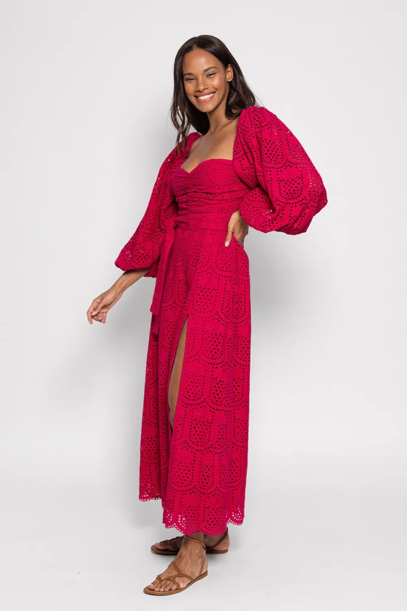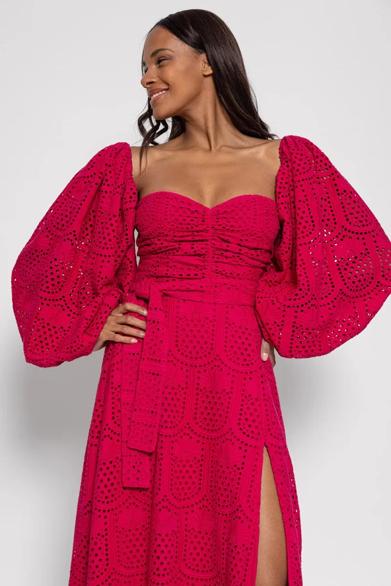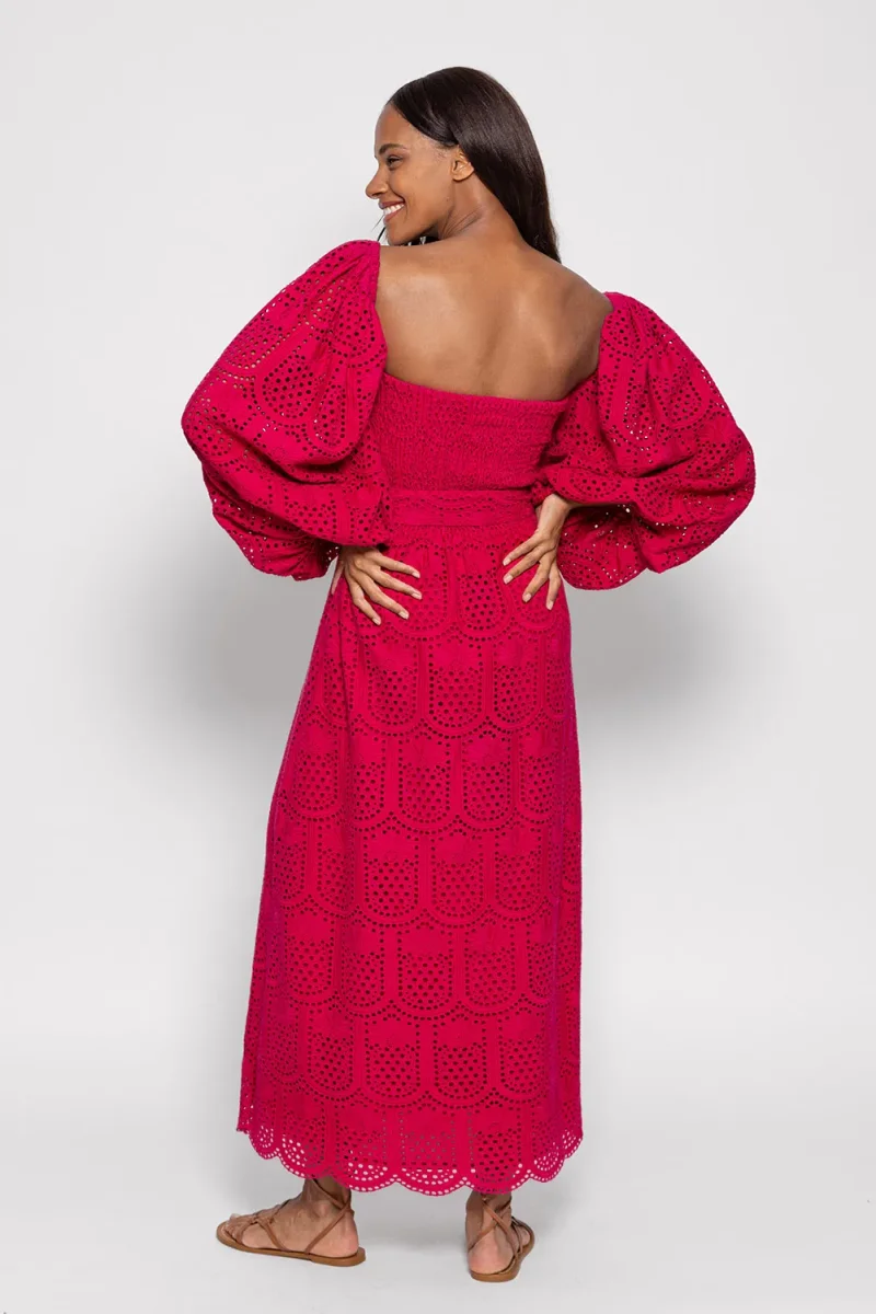 Réalisée en broderie anglaise en forme d’ananas, Lia est une robe bustier dont les manches ballons se portent sur ou sous les épaules. L’encolure légèrement en cœur a une découpe créant de légères fronces sur le devant et possède un dos smocké. Fendu sur le côté, le bas évasé de cette robe dévoile joliment les jambes. Une ceinture séparée se noue à la taille au gré de vos envies. La robe Emilia est synonyme de féminité.