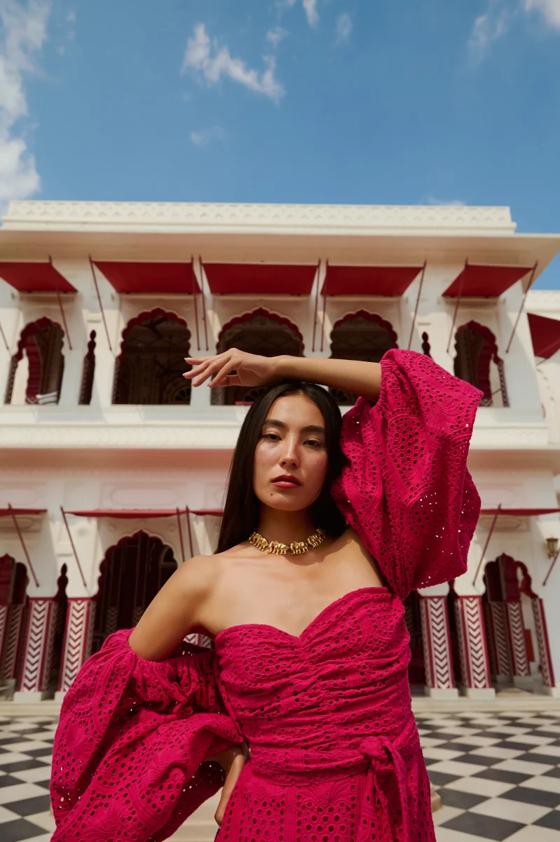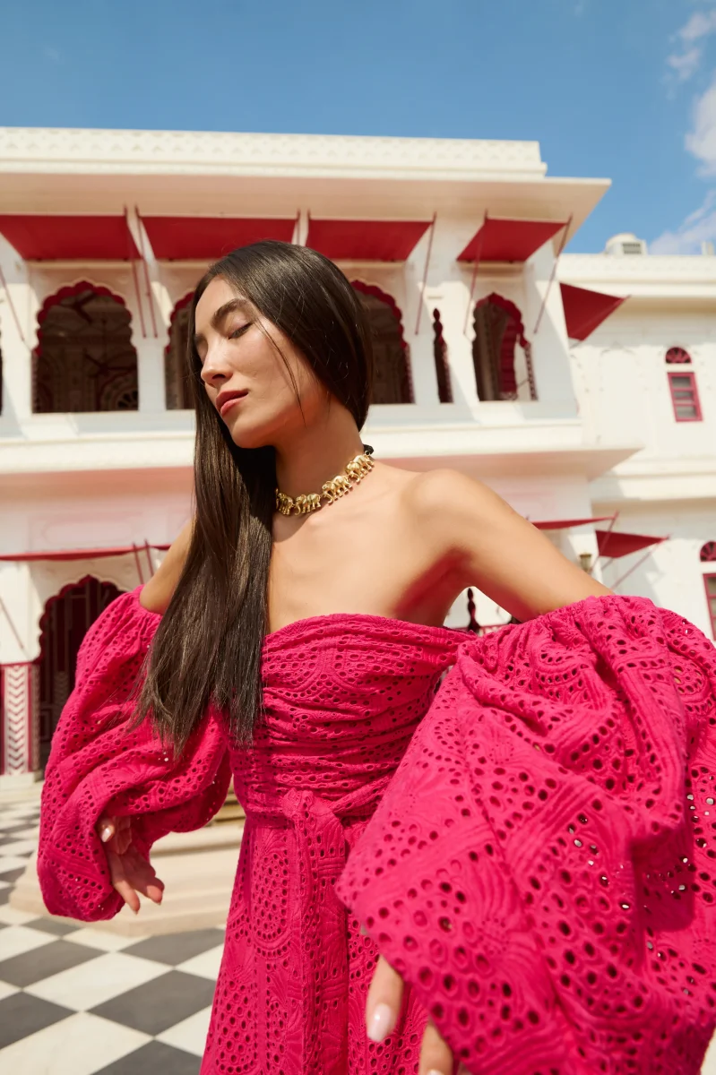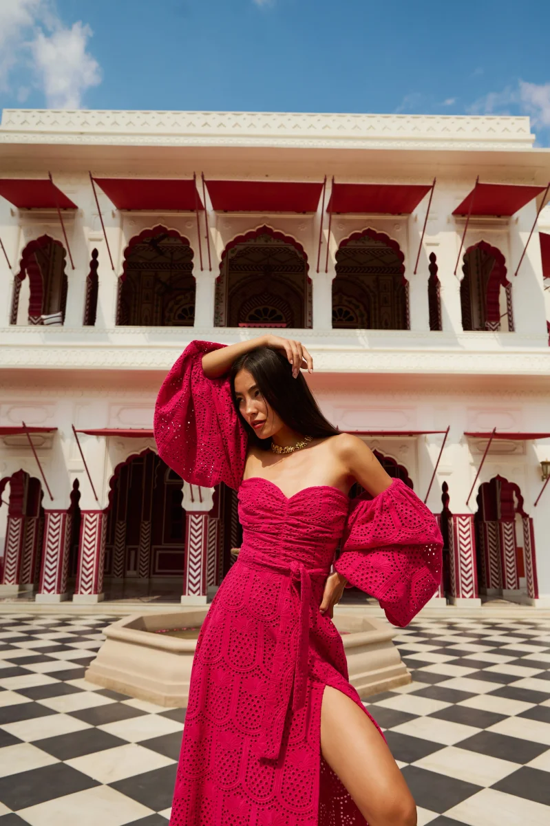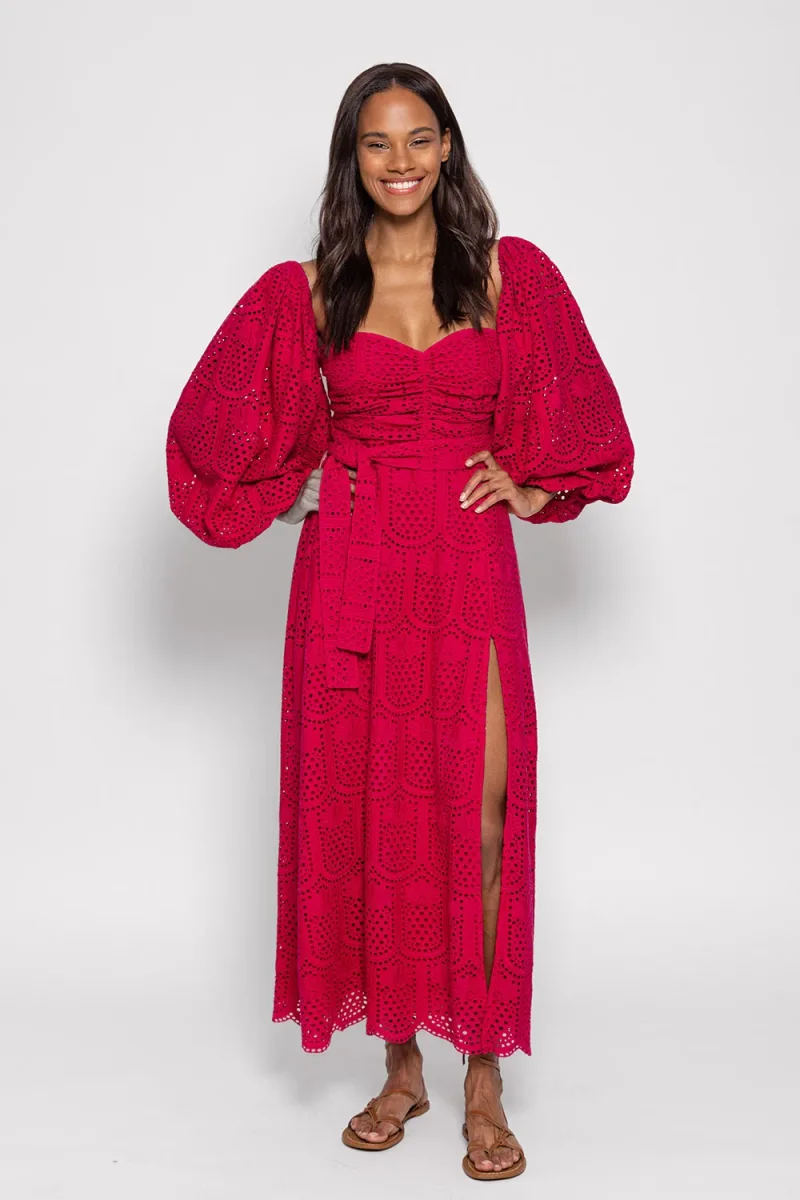 Réalisée en broderie anglaise en forme d’ananas, Lia est une robe bustier dont les manches ballons se portent sur ou sous les épaules. L’encolure légèrement en cœur a une découpe créant de légères fronces sur le devant et possède un dos smocké. Fendu sur le côté, le bas évasé de cette robe dévoile joliment les jambes. Une ceinture séparée se noue à la taille au gré de vos envies. La robe Emilia est synonyme de féminité.