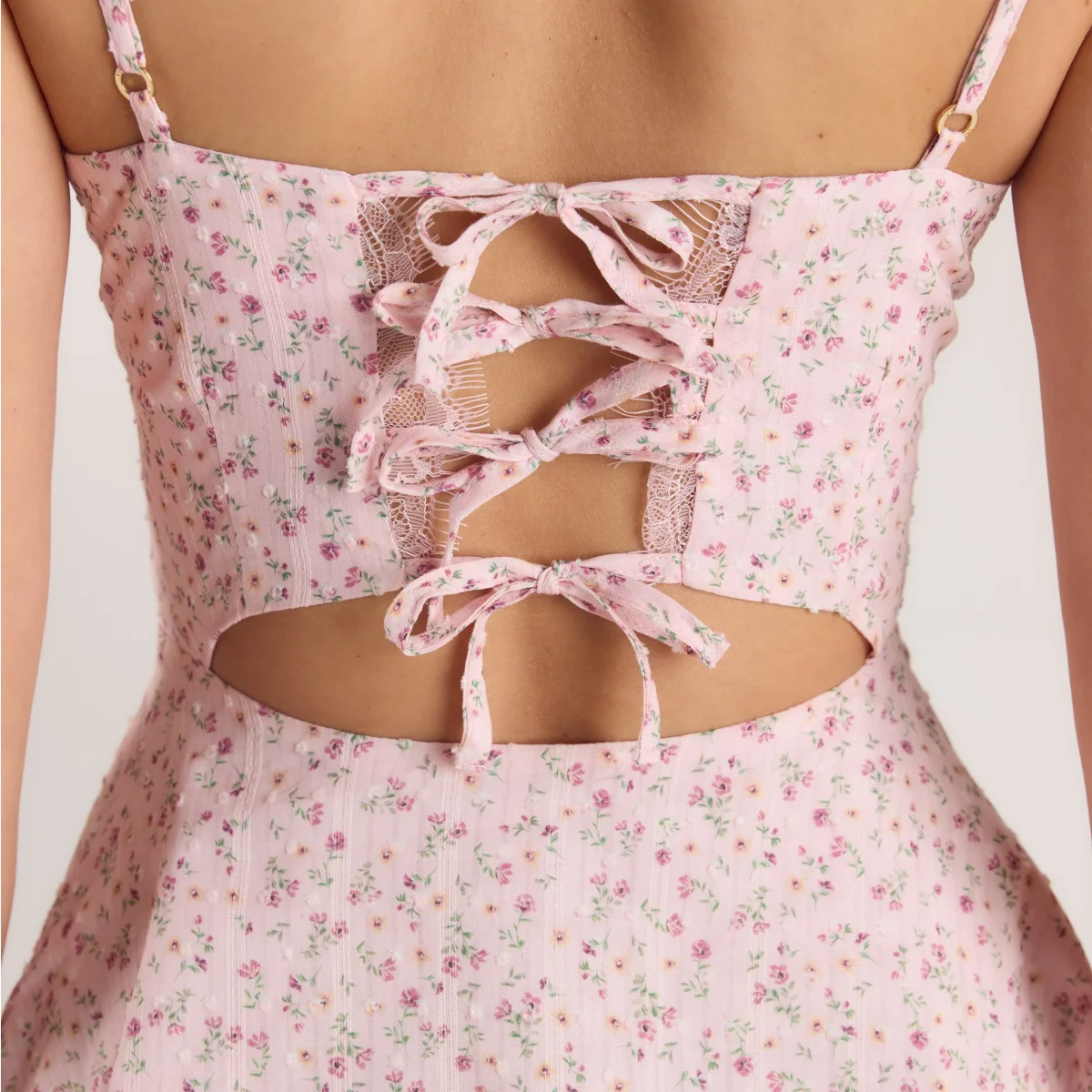 Cette mini-robe douce et texturée est la pièce idéale à ajouter à votre garde-robe printanière. Le tissu à pois dobby, les plis sous la poitrine, les fermetures à nouer et les bordures en dentelle confèrent à cette robe un style délicieusement fantaisiste.