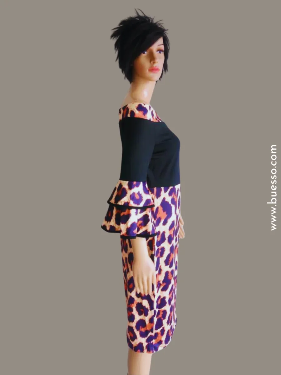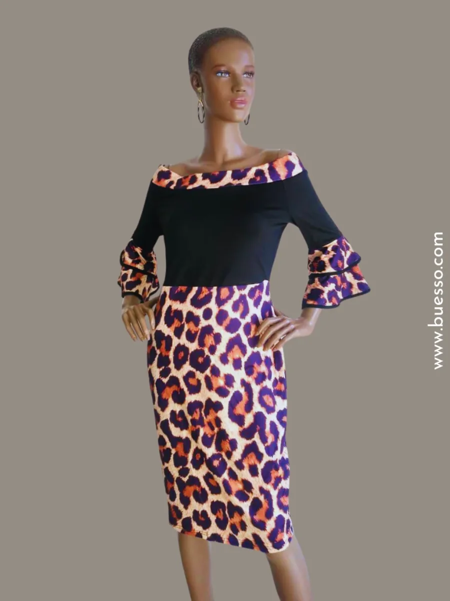 Affirmez votre style avec notre robe léopard élégante, symbole d’audace et de féminité. Sa coupe mi-longue met en valeur votre silhouette avec grâce, tandis que son col bateau souligne délicatement les épaules pour une allure à la fois chic et séduisante. Ses manches 3/4 à volants apportent une touche originale.