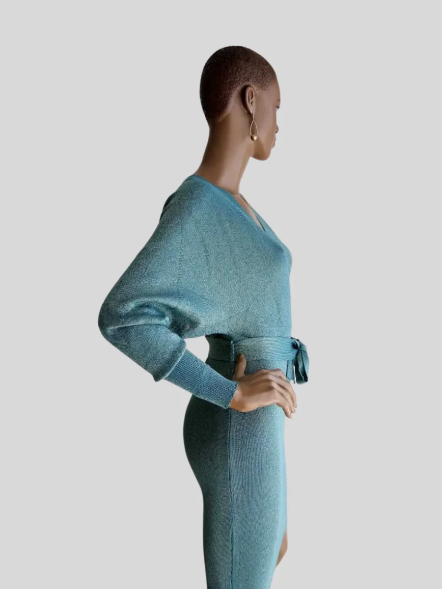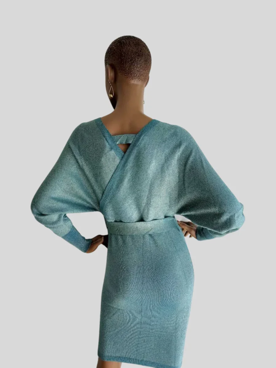 Robe-pull VERTE pailletée cache-cœur à nouer