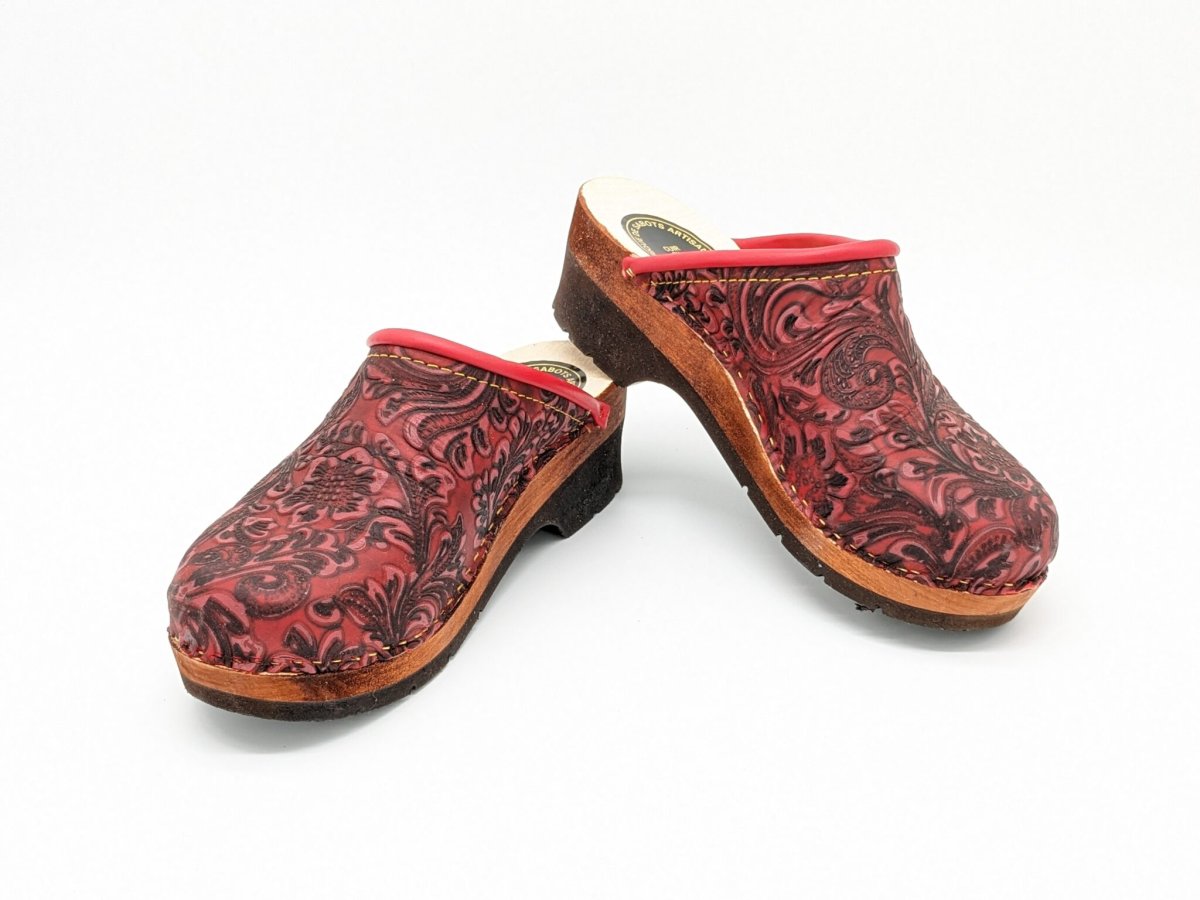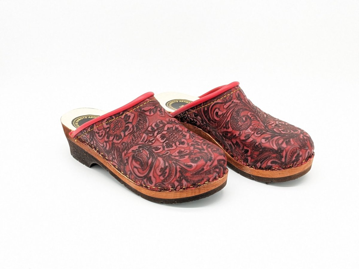 Ce sabot est en cuir de vachette, avec des reliefs à motif écorce, couleur rouge. Fabriqués en France, nos produits ont été confectionnés artisanalement dans notre atelier en Mayenne. Nous prêtons une grande attention à la qualité du cuir et nous fournissons en Espagne.
