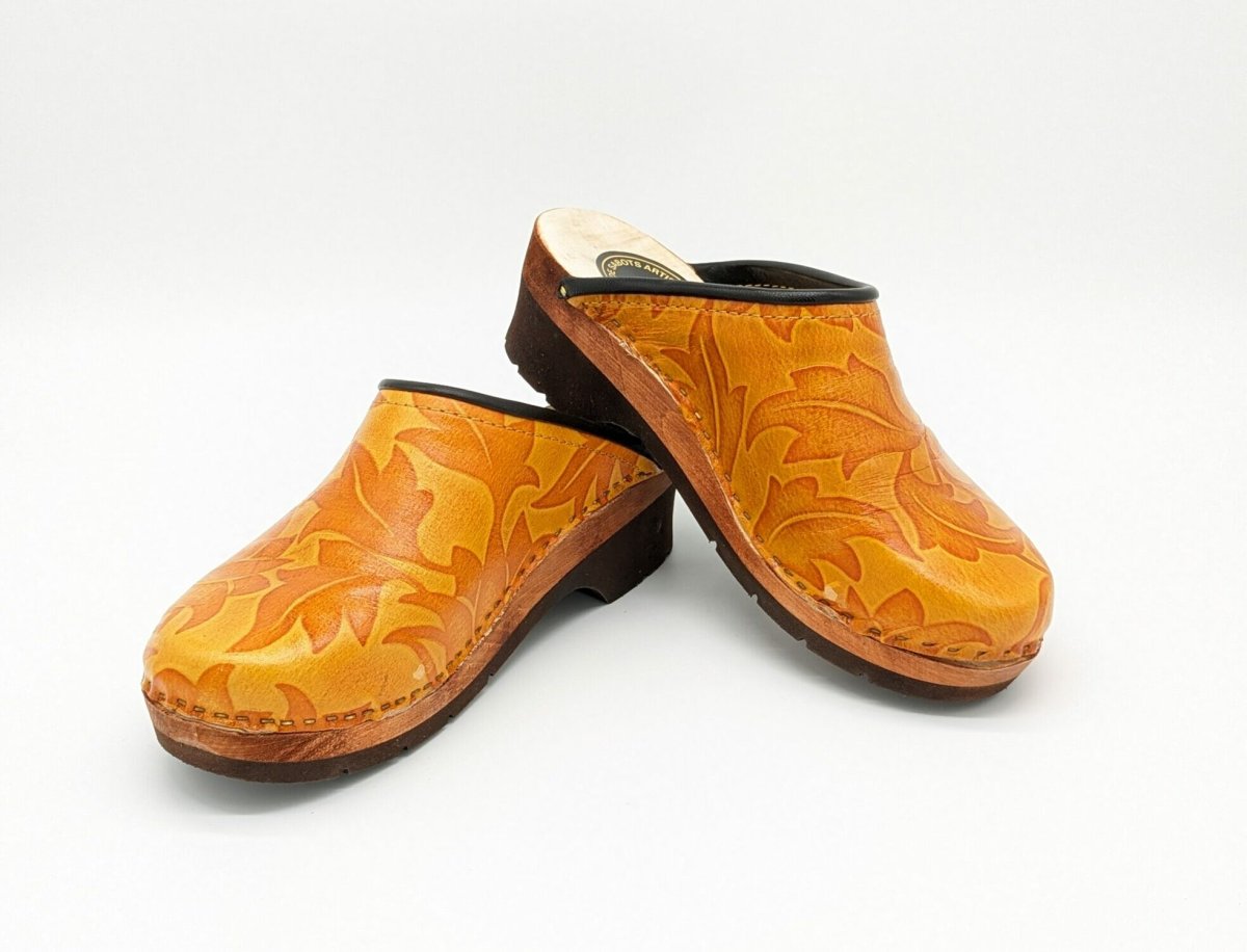 Ce sabot est en cuir de vachette, imprimé à fleur, couleur jaune. Fabriqués en France, nos produits ont été confectionnés artisanalement dans notre atelier en Mayenne. Nous prêtons une grande attention à la qualité du cuir et nous fournissons en Espagne.