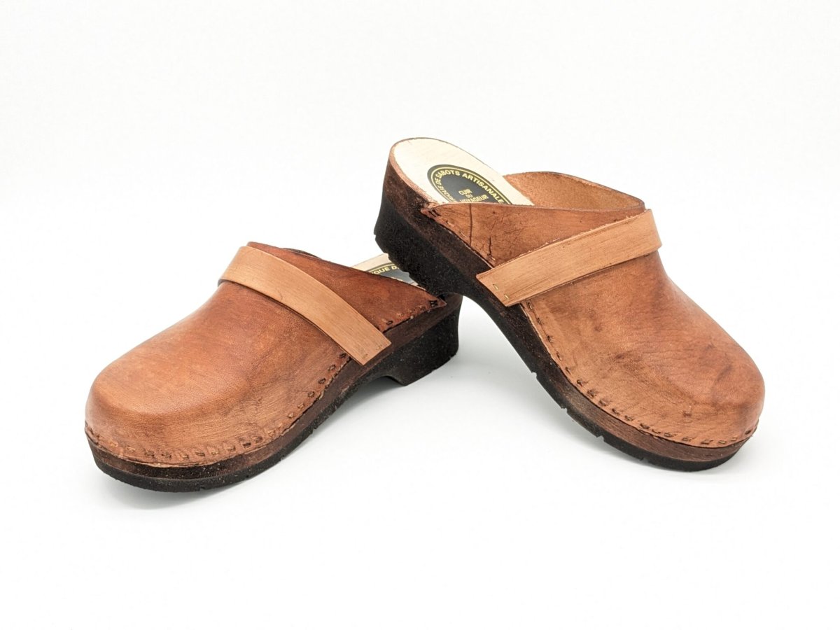 Nos sabots se composent d’une semelle en polyuréthane, du bois d’aulne et un dessus en cuir de vachette. La semelle en polyuréthane présente de nombreux avantages : antidérapant, resemellable, peu sonore. Nous avons choisi du bois d’aulne pour que la sensation soit légère.