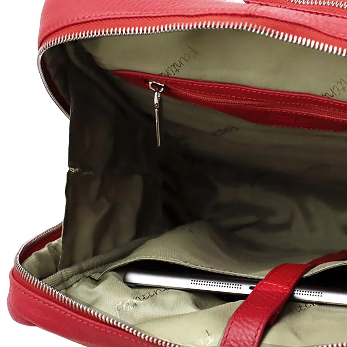 Le sac à dos Fortuna incarne la modernité et constitue un accessoire de mode haut de gamme dans notre collection. Le cuir martelé confère à ce modèle une singularité inégalée, alliant élégance et contemporanéité, idéal pour les femmes qui aiment oser avec des teintes vives et élaborer sans cesse des tenues distincte et créatives. Ce sac à dos rouge en cuir martelé est doté de poches internes et externes permettant d’organiser divers objets, incluant également un compartiment pour l’ordinateur portable ; c’est donc le compagnon parfait tant pour le travail que l’université. Ses bretelles ajustables ainsi que sa poignée renforcée, ses coutures artisanales accompagnées du logo Fantini gravé sur un petit triangle argenté rehaussent cet article unique en son genre. Son design novateur aux lignes angulaires fait de ce mini-sac à dos un accessoire pétillant, essentiel dans toute garde-robe féminine. À partir d’aujourd’hui, vous ne pourrez plus vous passer de nos articles en cuir; ils sont confectionnés dans une matière durable conçue pour résister au fil du temps.