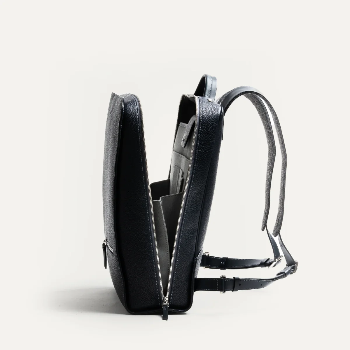 Les bretelles doublées de feutrine assurent un excellent confort, même durant les journées les plus longues. Le réglage invisible de ces sangles évite toute rupture visuelle. À l’arrière, une poche zippée discrète permet de garder à portée de main téléphone, passeport ou carte.