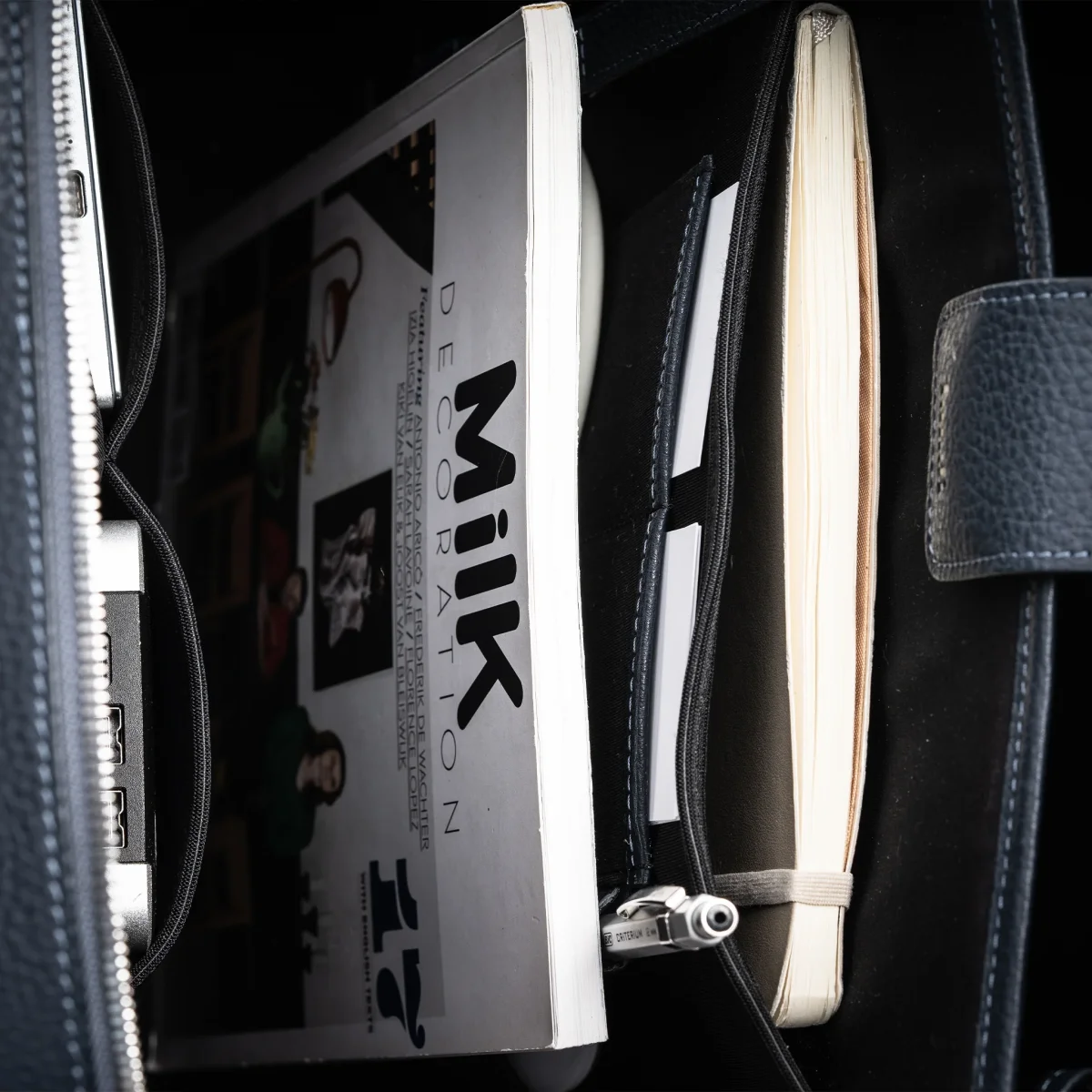 L’intérieur du sac, habillé d’Alcantara, protège efficacement votre ordinateur portable jusqu’à 16 pouces. Il intègre plusieurs poches en néoprène pour organiser câbles, chargeurs, stylos et documents de manière fluide et accessible.