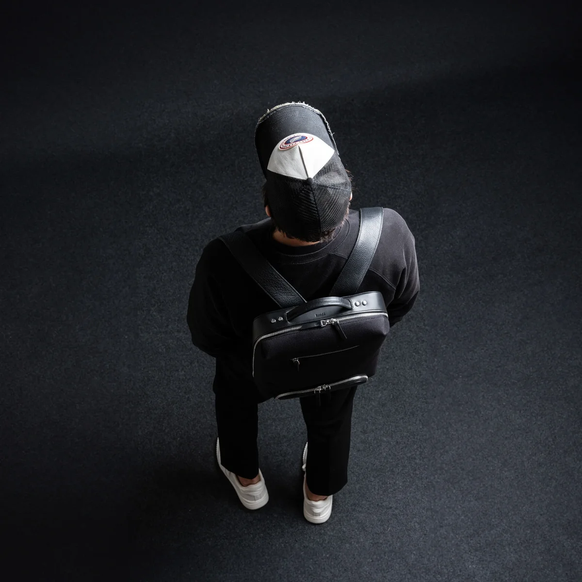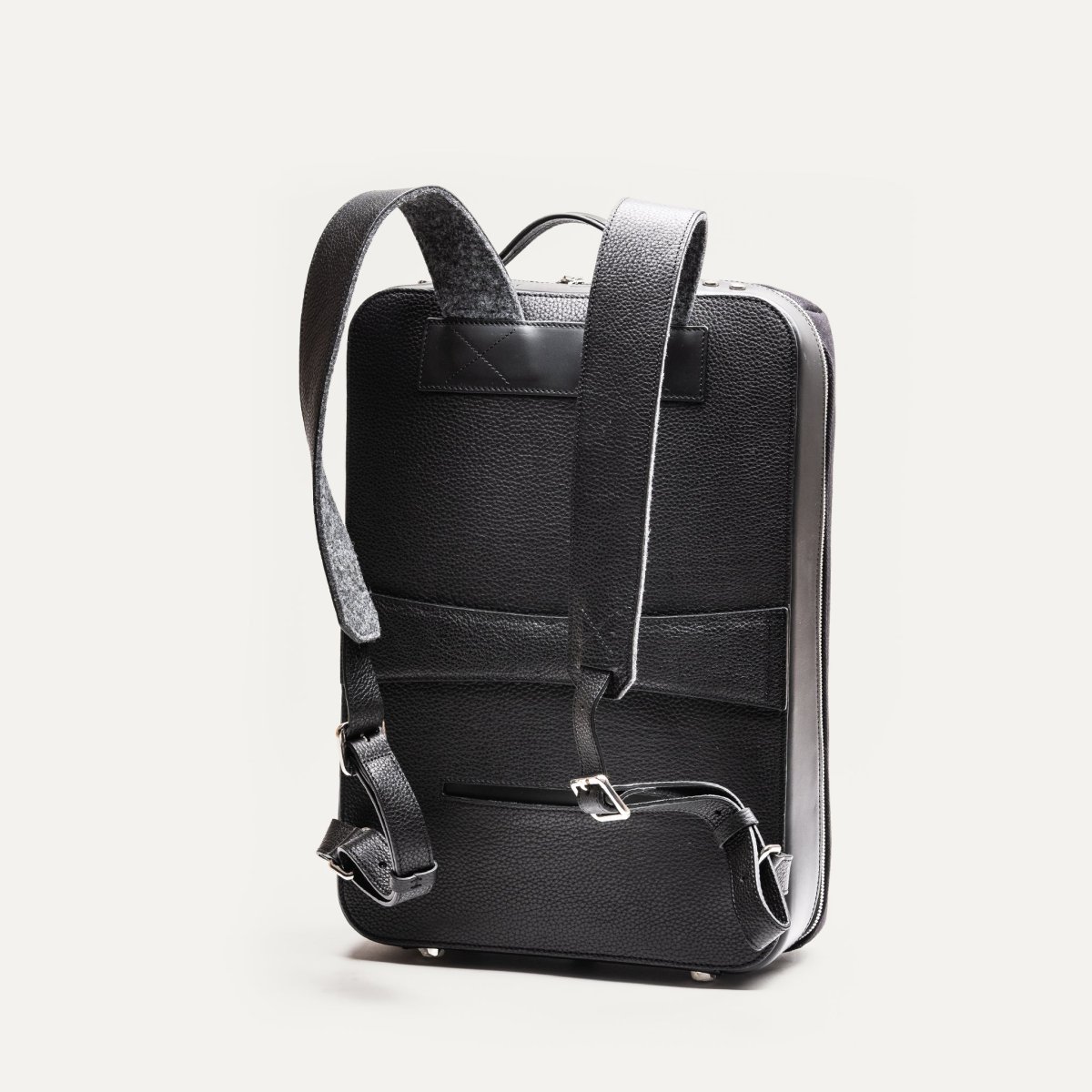 Le dos du sac est réalisé en cuir grainé au tannage végétal, pour un rendu texturé et durable. Les bretelles sont également doublées de feutrine pour un meilleur confort de portage. Un soin particulier a été apporté à chaque détail, à la fois pour préserver une esthétique sobre et garantir une solidité à toute épreuve.