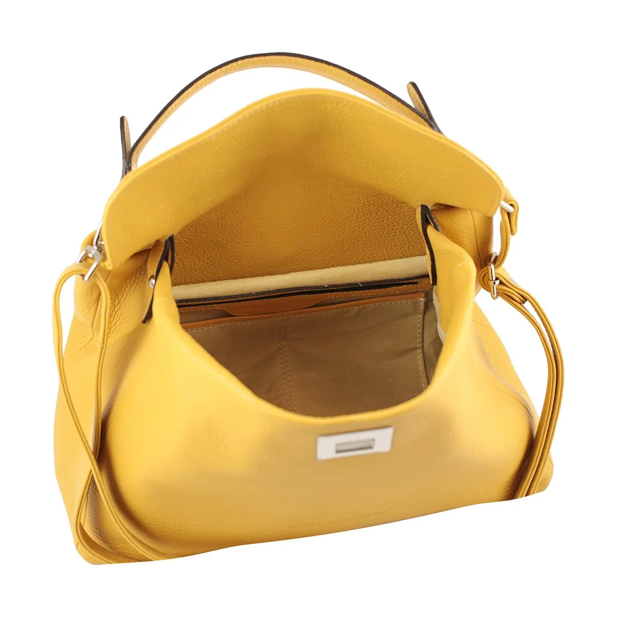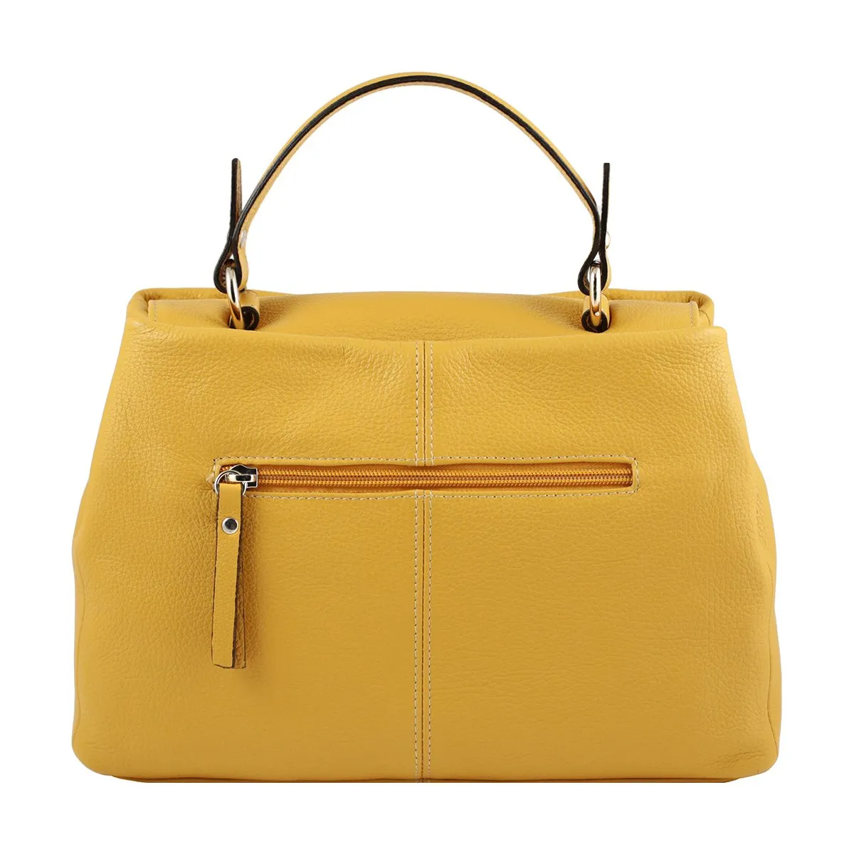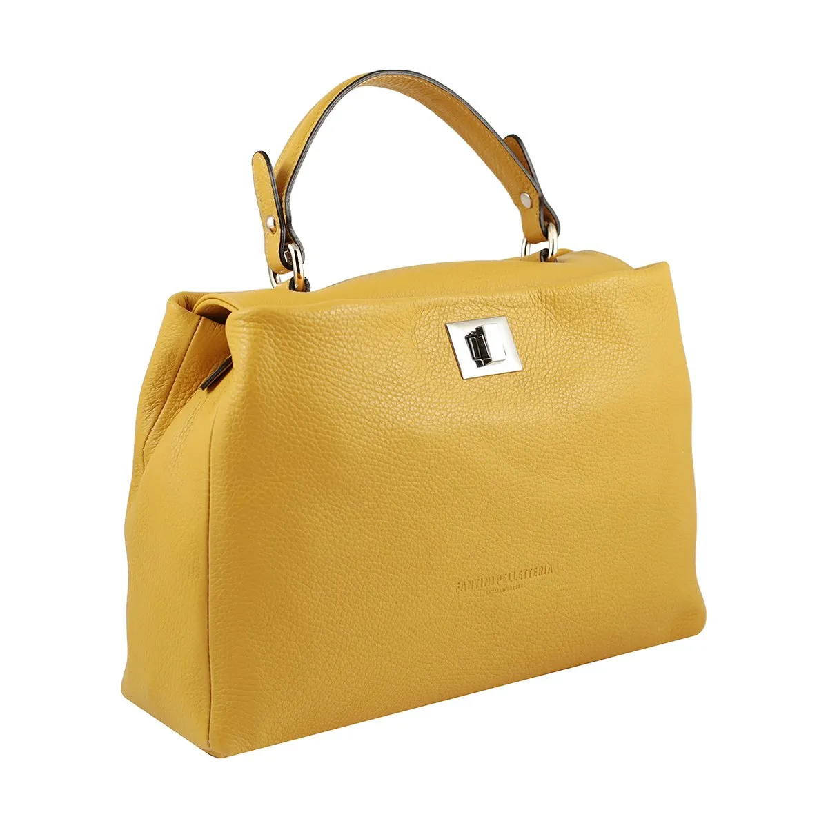 Un petit sac à main élégant et unique, pratique et polyvalent : c’est le sac en cuir Pompei ! Ce modèle se distingue par son cuir martelé, particulièrement durable et résistant aux usages fréquents. Le matériau affiche une teinte vive et singulière : un jaune éclatant. Il est donc idéal pour les saisons estivales ainsi que pour des tenues audacieuses ! Cet accessoire présente un format généreux ; l’intérieur offre beaucoup d’espace avec diverses poches et compartiments pour ranger tout ce dont vous avez besoin au quotidien. À l’extérieur, on trouve une fermeture à pression accompagnée d’une poche zippée à l’arrière. Vous avez également la possibilité de porter le sac en bandoulière grâce à sa sangle amovible et ajustable ou bien à la main avec sa poignée en cuir. Cette borsetta jaune confectionnée en véritable cuir bénéficie aussi de la certification Made in Italy. Choisissez votre couleur favorite et profitez de cet accessoire partout où vous allez !