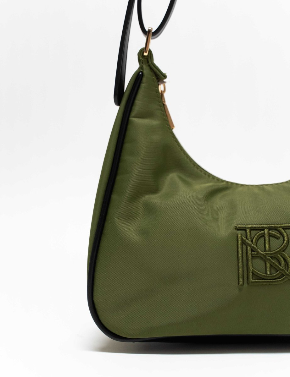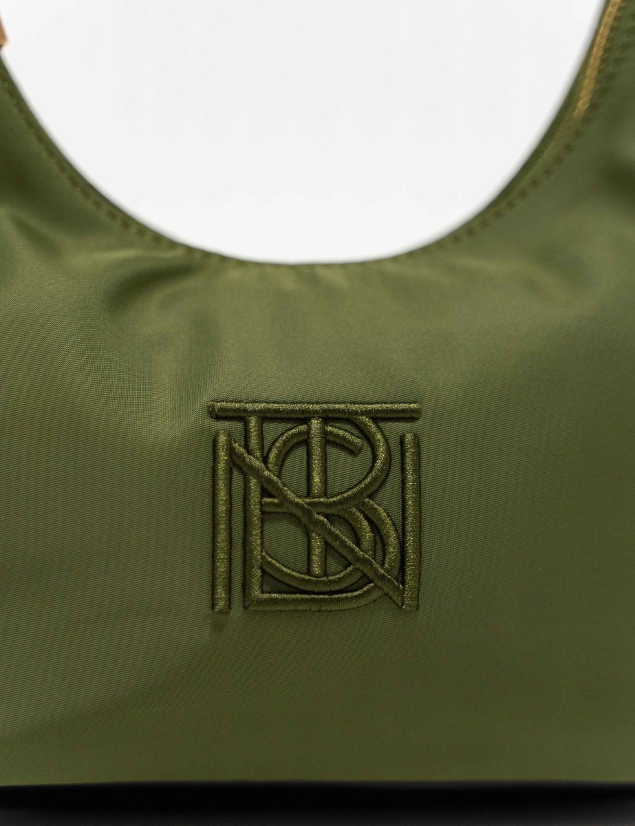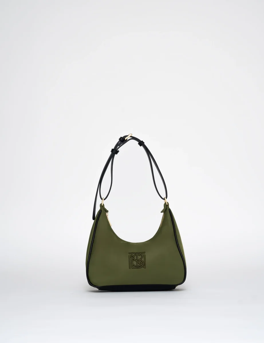 Un format compact aux lignes légèrement arrondies, structuré par une base discrètement renforcée. La surface en nylon recyclé offre un rendu mat et souple où le monogramme Bestini apparaît brodé ton sur ton.
