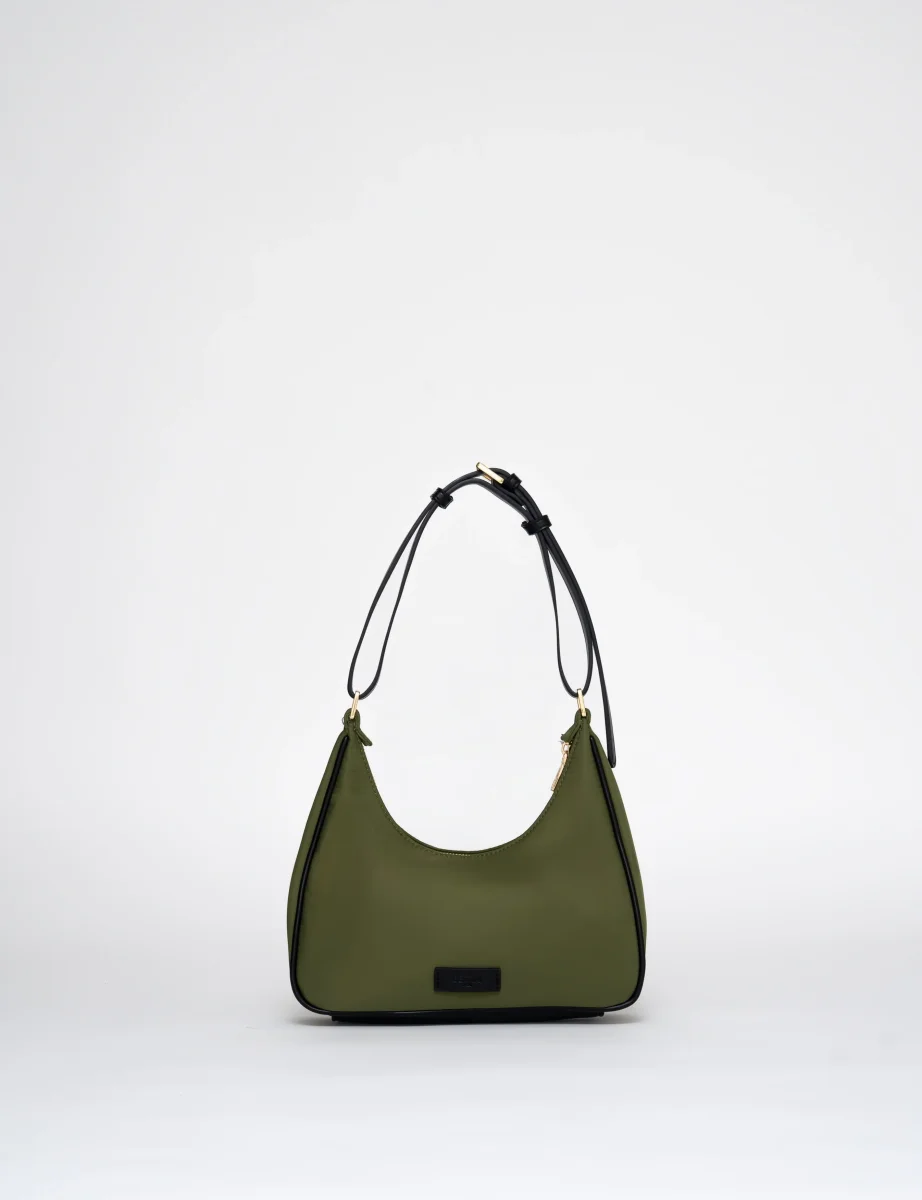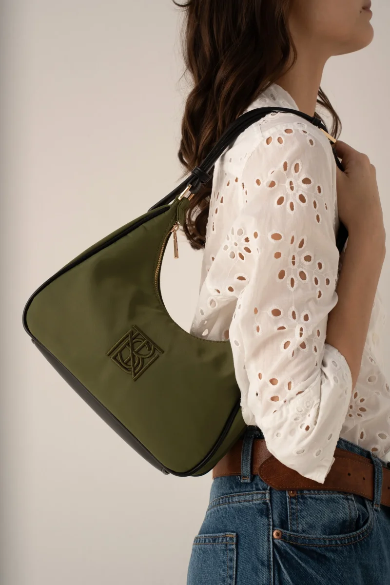 Sa silhouette baguette se pose naturellement sous l’épaule. Le volume reste léger et équilibré, prolongé par une anse fine réglable inspirée d’une ceinture.
