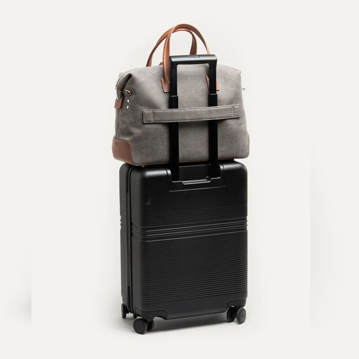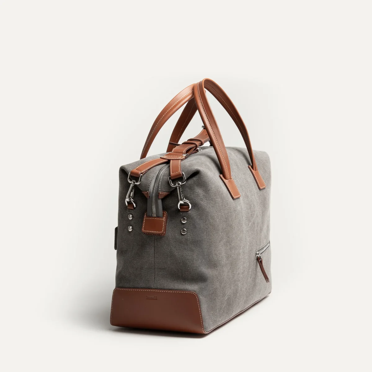 Ce modèle est confectionné dans une toile de coton déperlante grise, associée à notre cuir lisse cognac au tannage semi-végétal. Cette combinaison de matières offre souplesse, durabilité et un style intemporel. Le cuir développera une belle patine avec le temps, rendant chaque pièce unique.