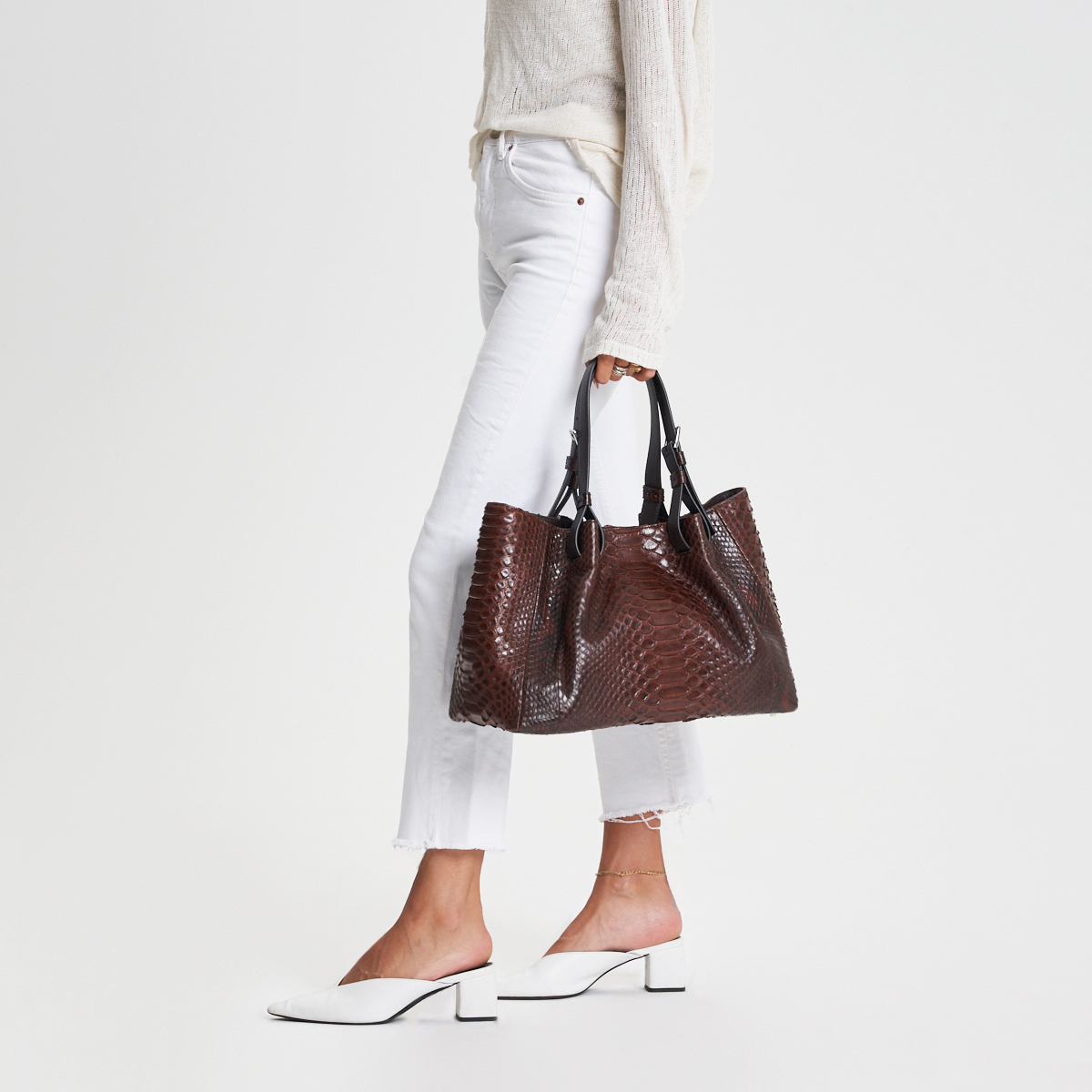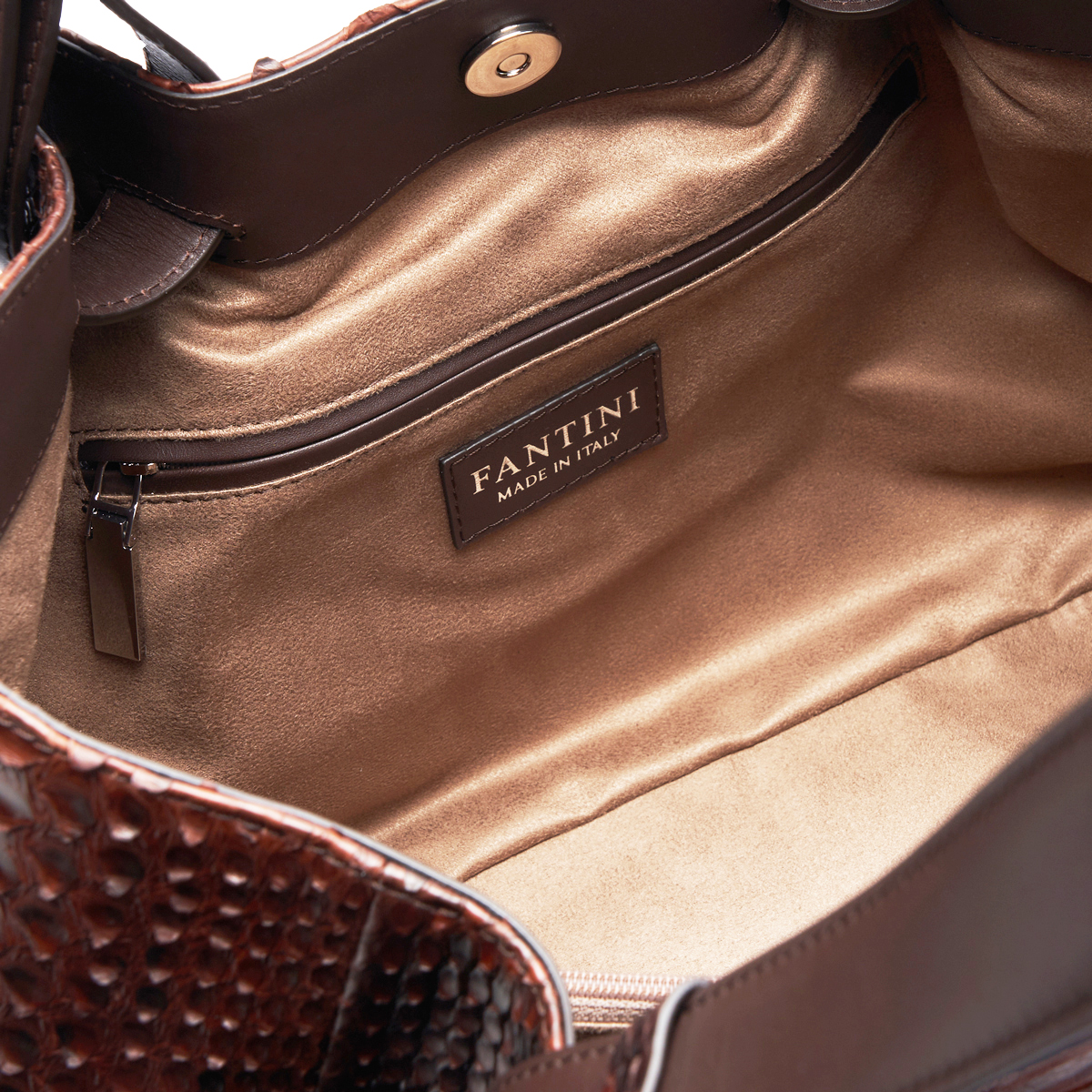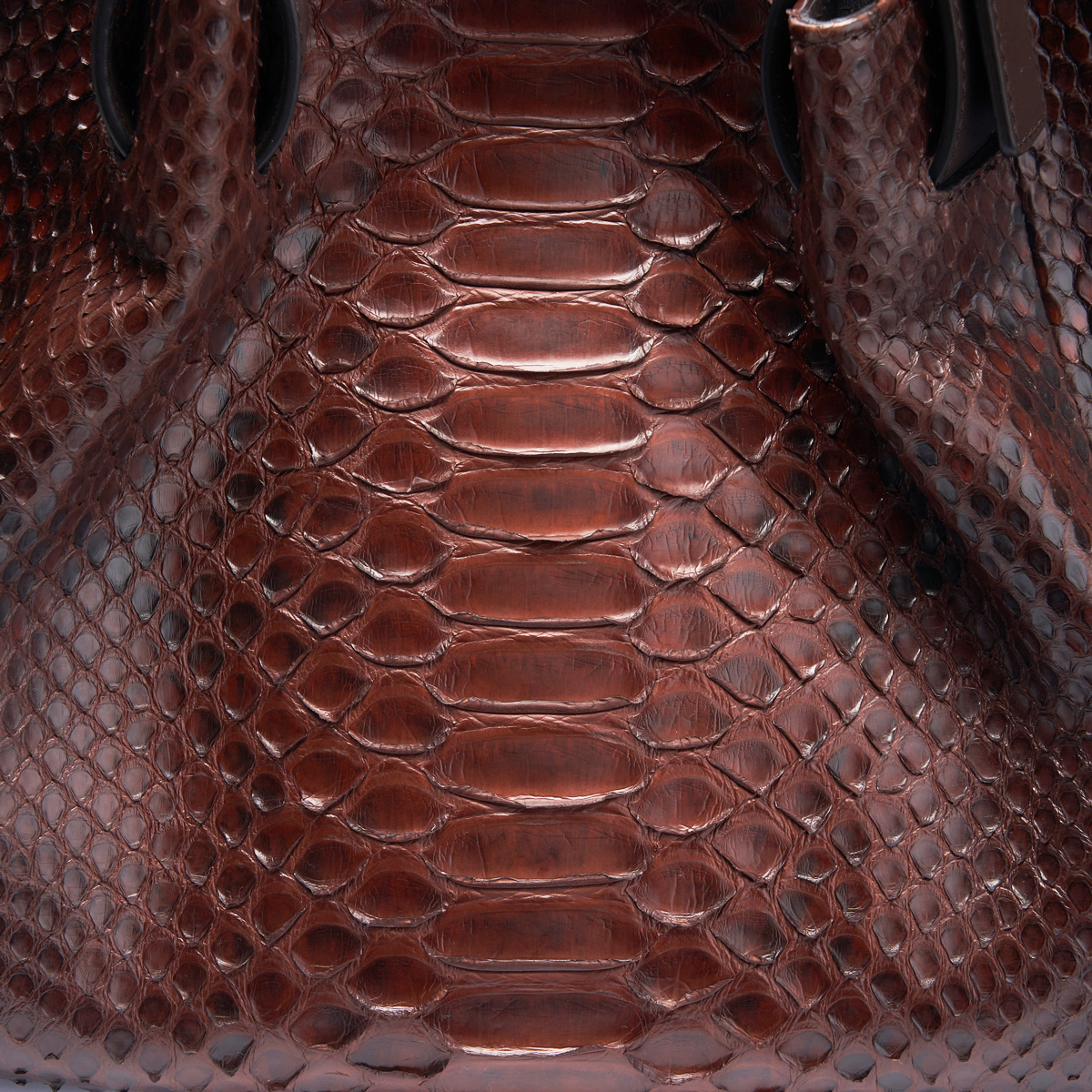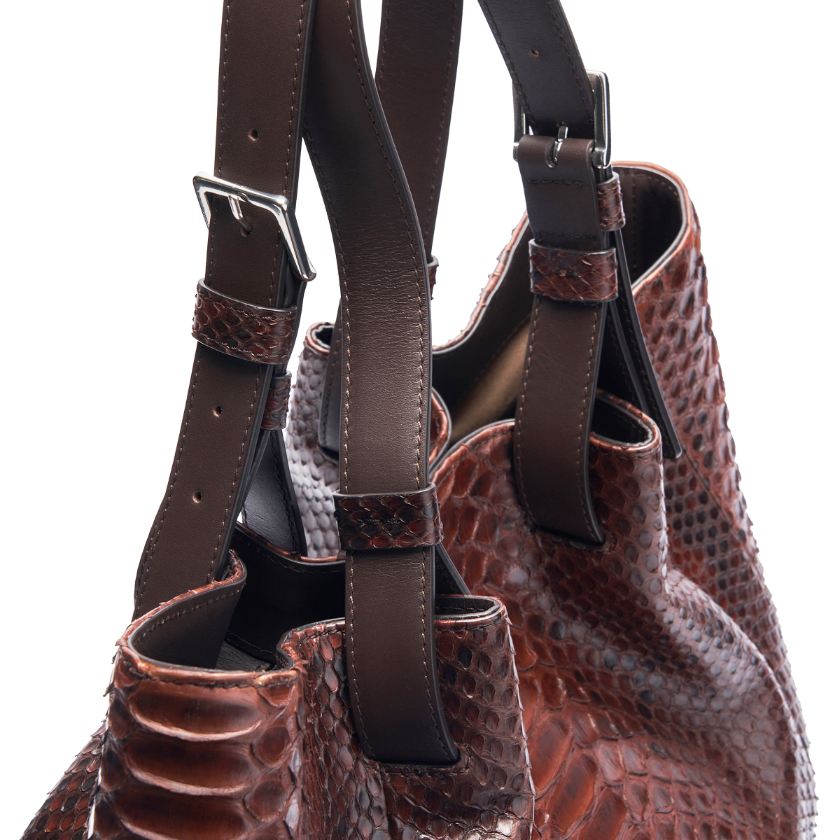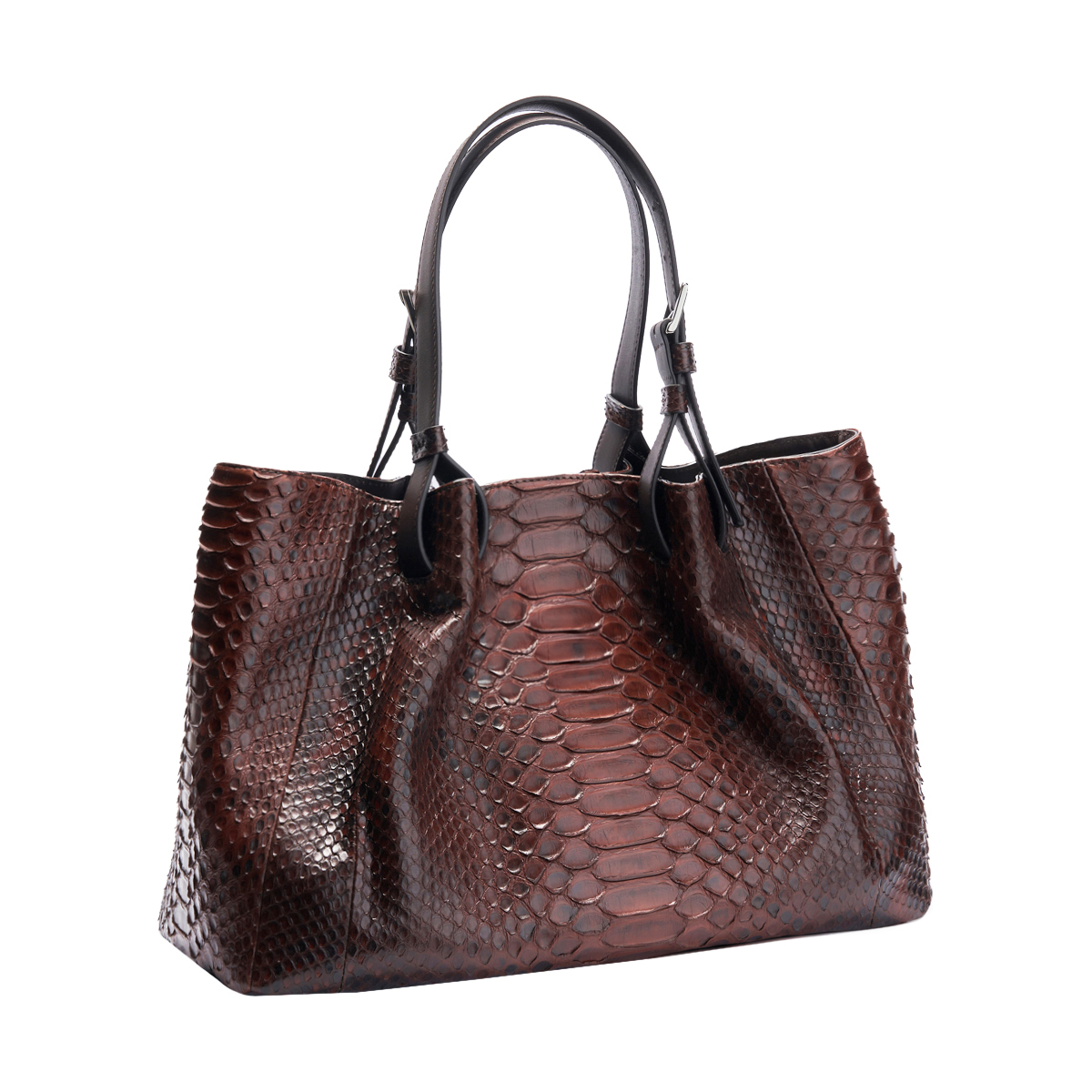 Fabriquée à la main en Italie, le sac Mirage en véritable cuir de python marron représente l’essence d’une sophistication intemporelle. La surface exhibe la texture naturelle des écailles, agrémentée de nuances chaudes et profondes qui soulignent la qualité exotique du matériau. Ses deux poignées solides et son design spacieux font de ce modèle un choix idéal pour une utilisation quotidienne, convenant parfaitement à ceux qui souhaitent conserver leur élégance même lors des journées les plus chargées. Le style est à la fois doux et précis, avec des coutures méticuleuses et une attention particulière aux détails dans chaque élément. Le cuir de python, soigneusement traité artisanale, assure une durabilité exceptionnelle tout en conférant un caractère distinctif à chaque pièce individuelle. À l’intérieur, l’agencement est astucieusement conçu pour accueillir tous vos essentiels quotidiens, faisant de Mirage une complice fiable jour après jour. Un accessoire raffiné qui apporte personnalité et singularité à celui ou celle qui le porte.