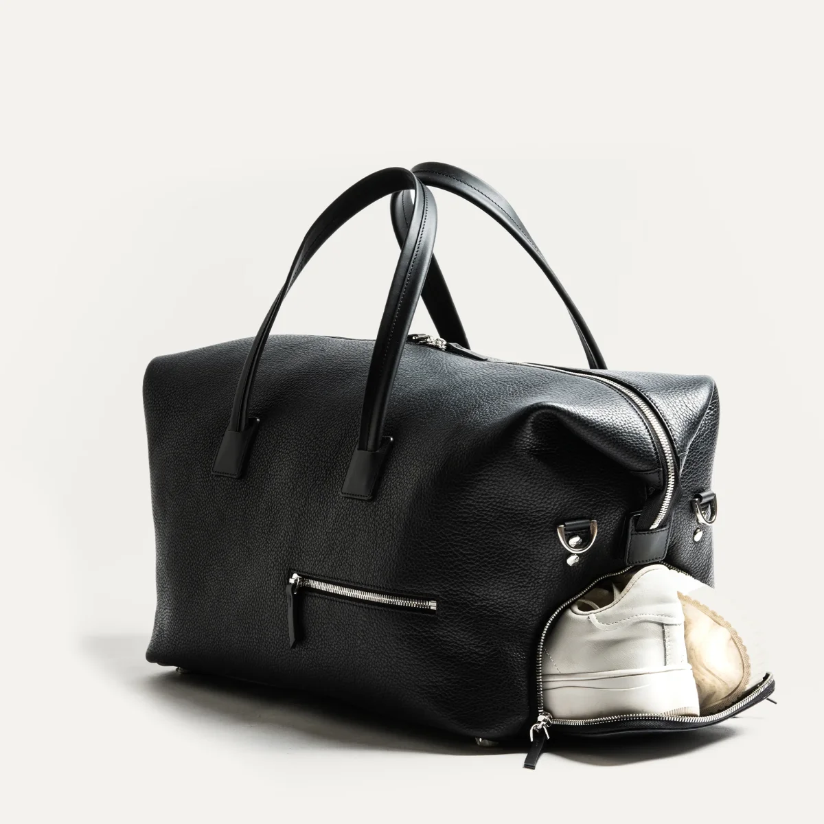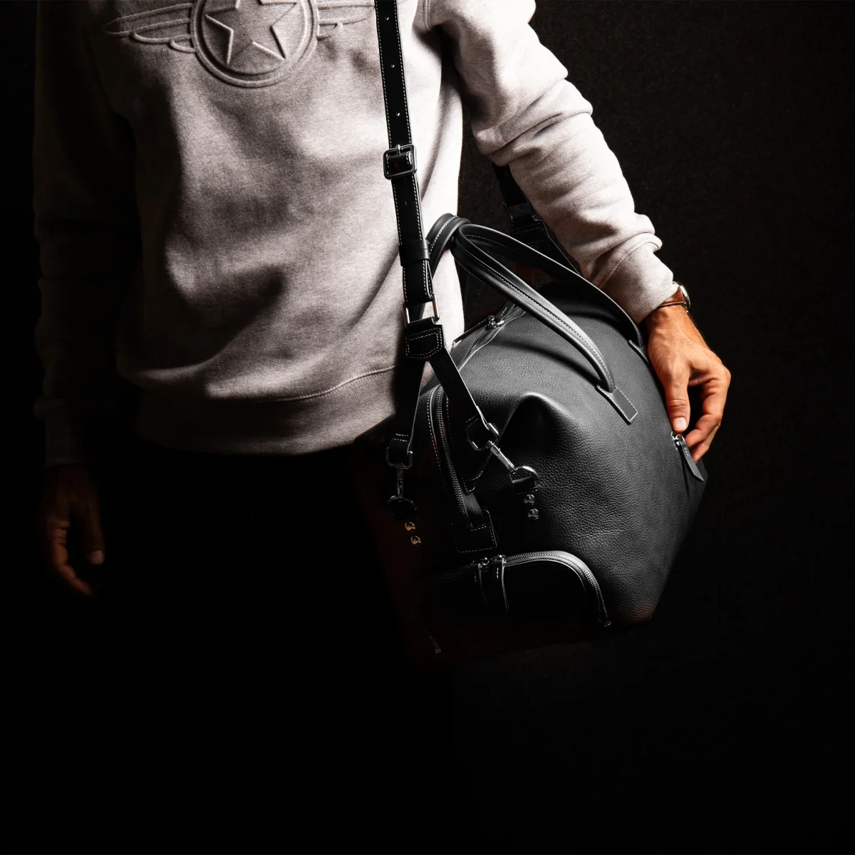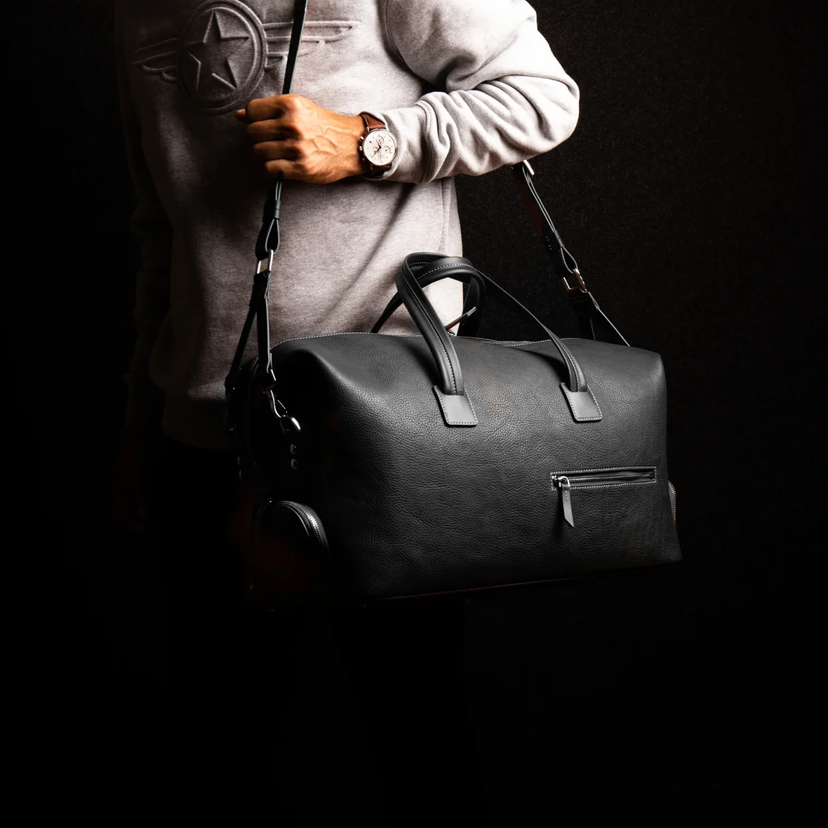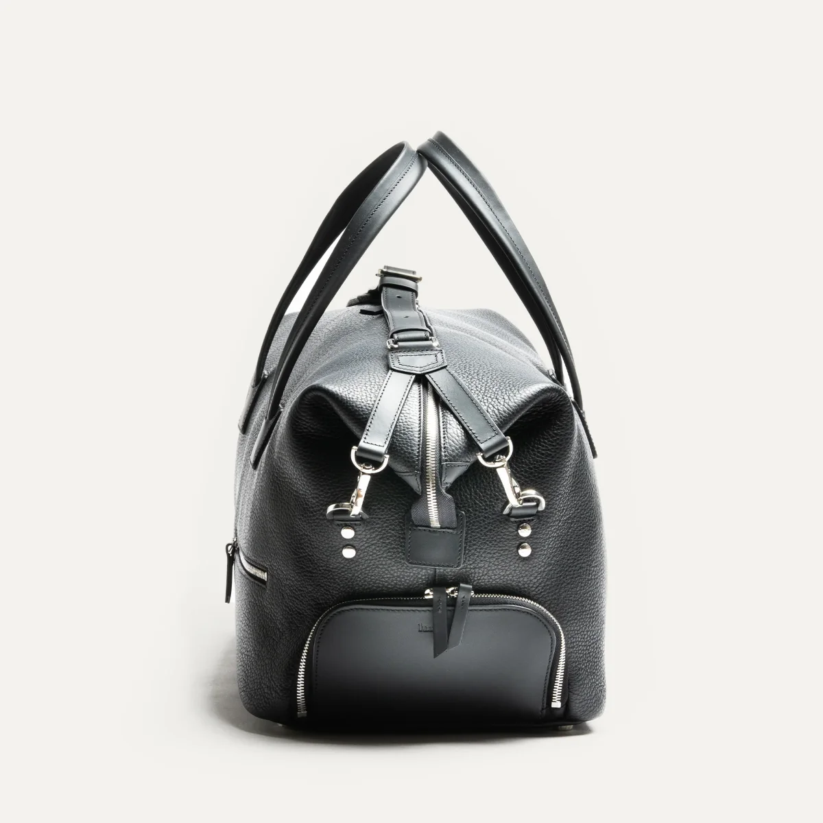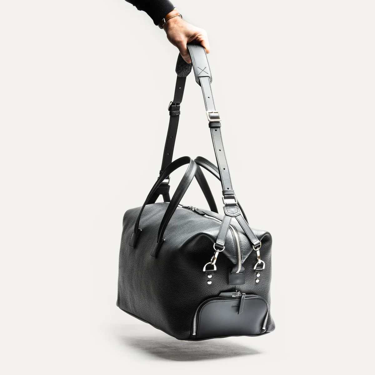 Réalisé en cuir noir pleine fleur mêlant grainé et lisse, ce sac allie souplesse, durabilité et raffinement. Il incarne parfaitement notre vision d’un accessoire de voyage moderne.