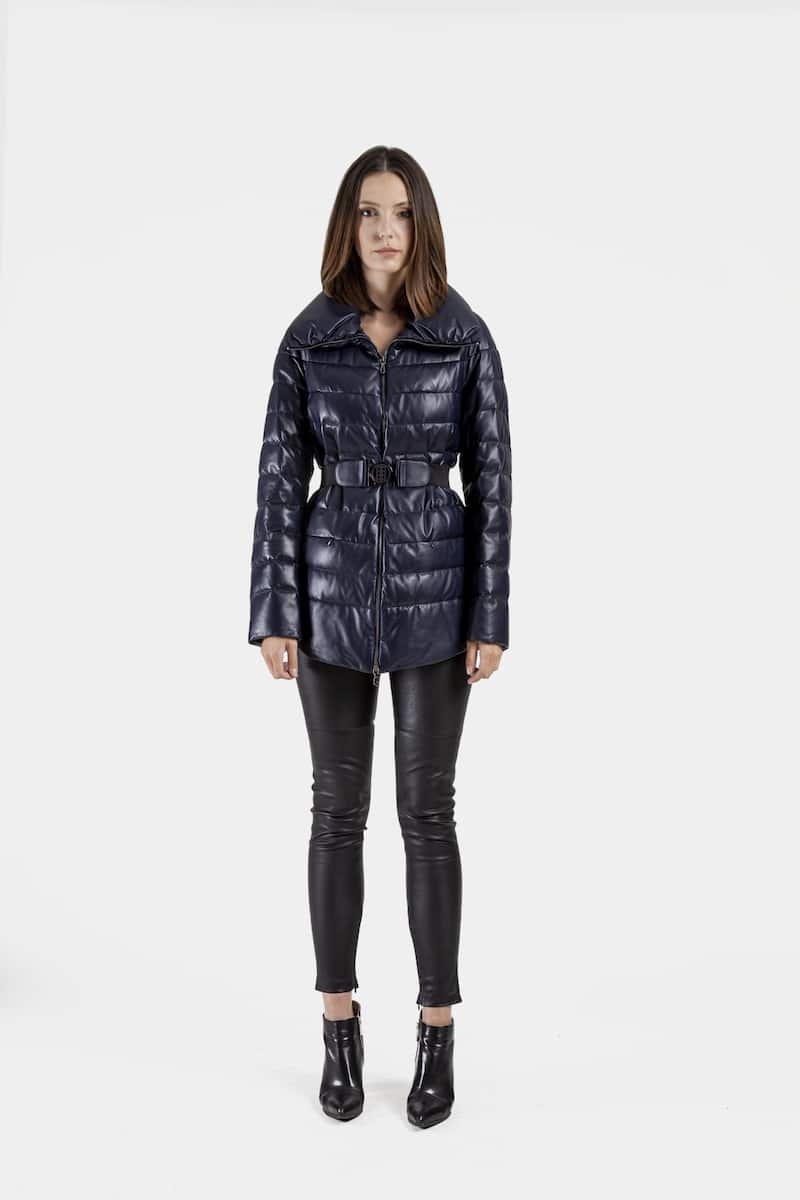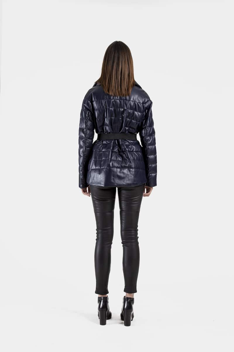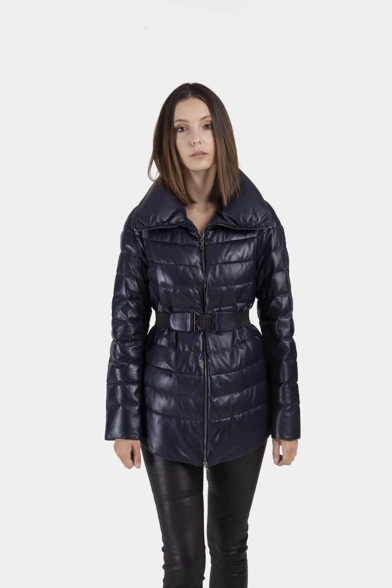 Cette veste mi-longue matelassée en cuir d’agneau couleur bleu marine présente un grand col montant, une fermeture éclair centrale, deux poches latérales invisibles, deux fentes zippées sur les côtés et une ceinture élastique à la taille.