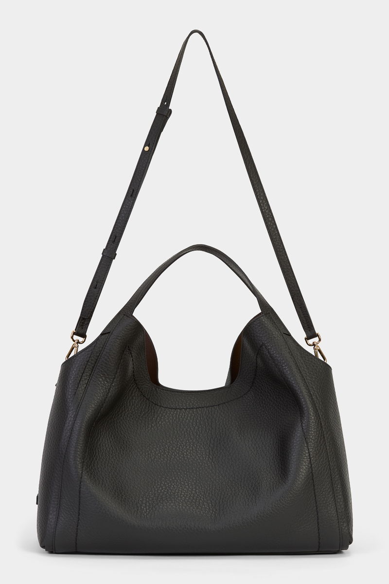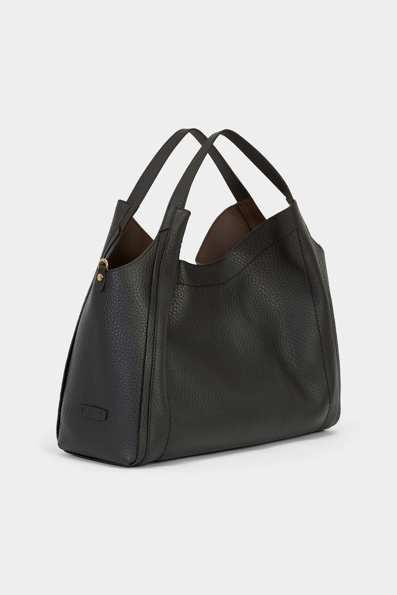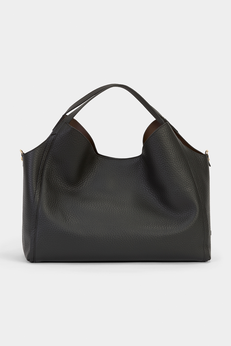Grand cabas souple en cuir de veau légèrement grainé, à la ligne fluide et au tombé naturel. Sa teinte noire apporte une touche chic à vos looks du quotidien. Un essentiel ultra-pratique, pensé pour accompagner vos journées bien remplies avec élégance.