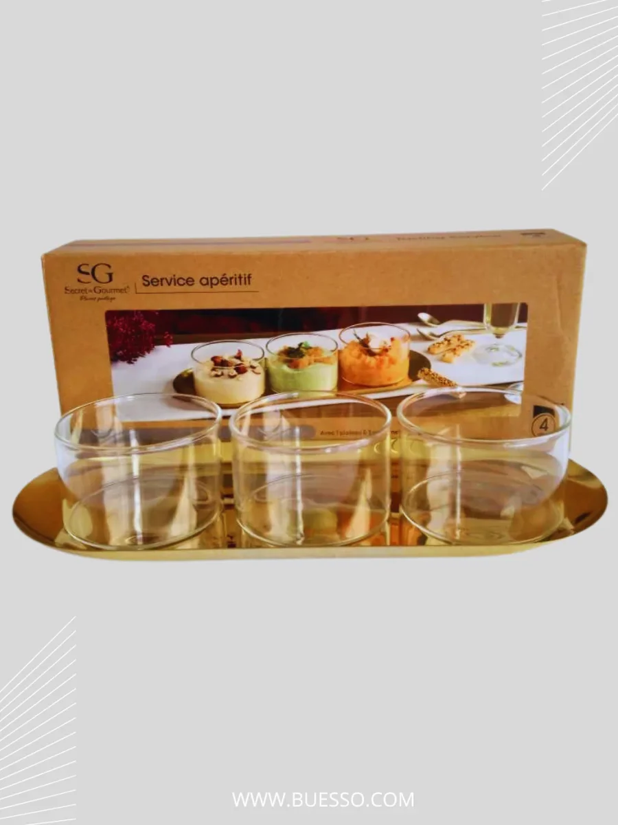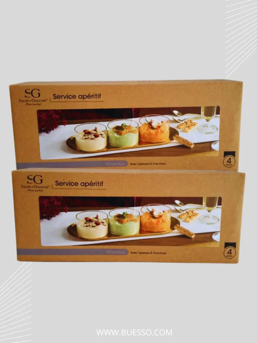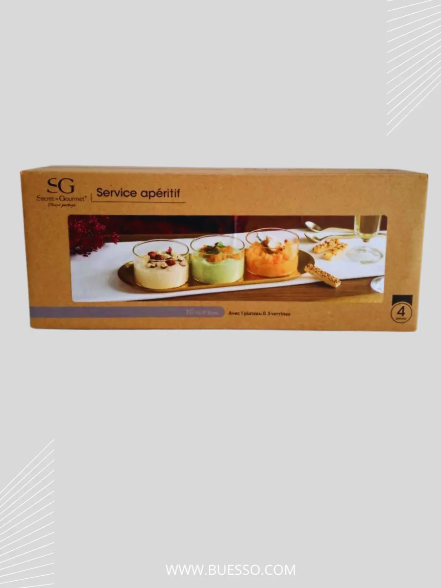 Découvrez notre service apéritif, dessert sucré et salé en verrine SECRET DE GOURMET en verrine qui ravira vos papilles ! un service apéritif sophistiqué et exclusif en verrine, parfait pour des occasions spéciales, pour les fêtes, pour ravir vos invités, pour une soirée gourmande. Ces délicieuses verrines pratiques allient saveurs sucrées et salées pour un plaisir gustatif unique. Offrez un apéritif raffiné et un dessert luxueux en un seul service.