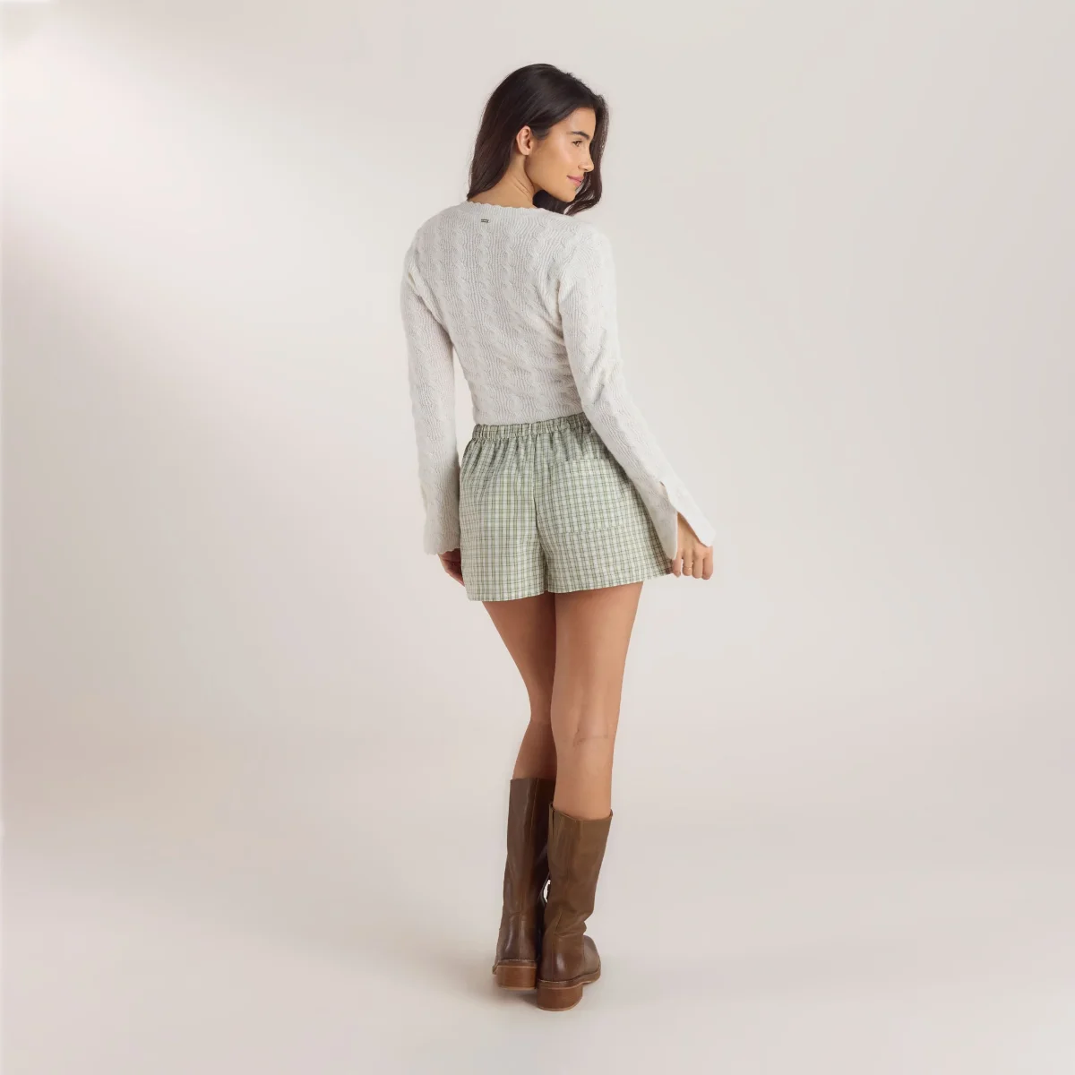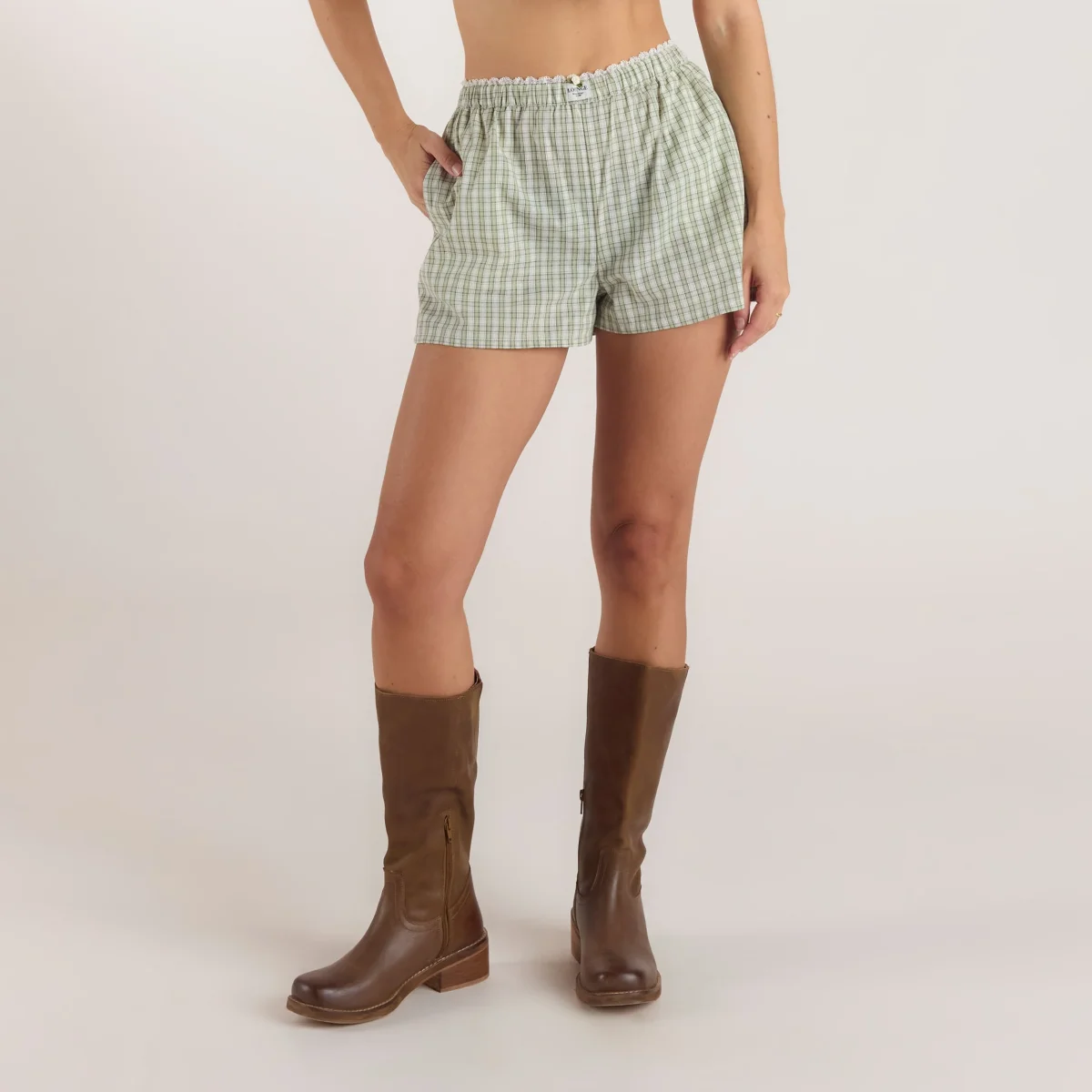 Le short en coton à carreaux possède une ceinture de style boxer et un petit bouton de rose pour une touche de féminité. Ce short sera un incontournable de votre printemps.