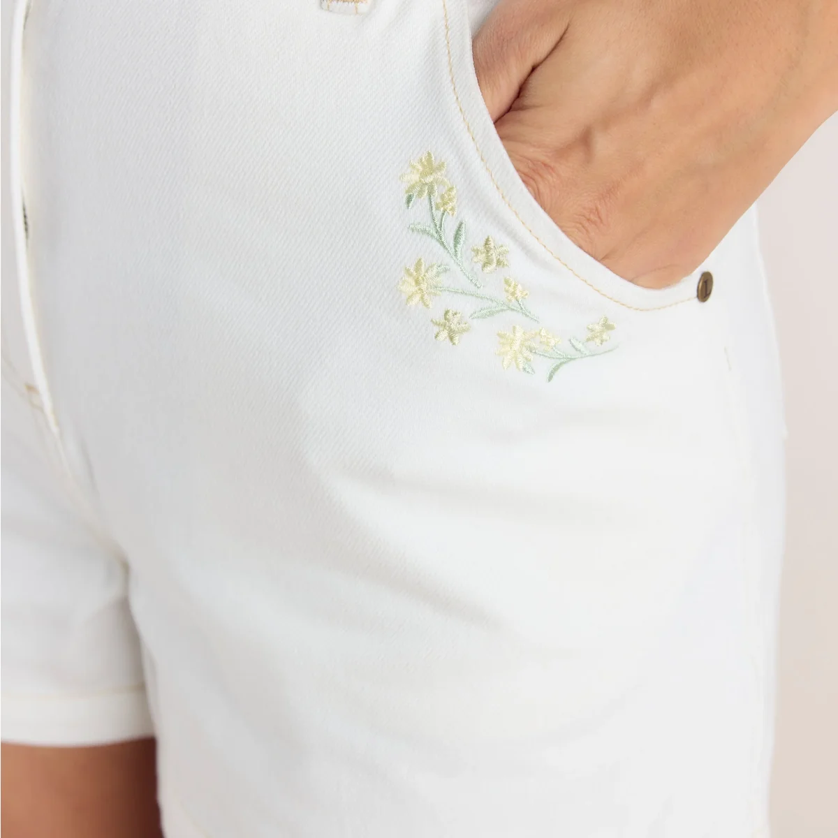 - Détails de broderies florales sur les poches, à l’avant et à l’arrière