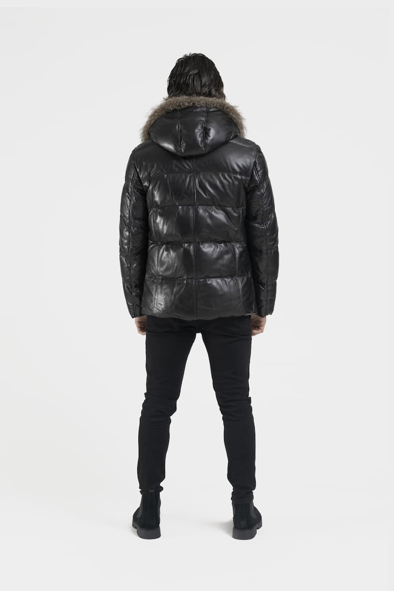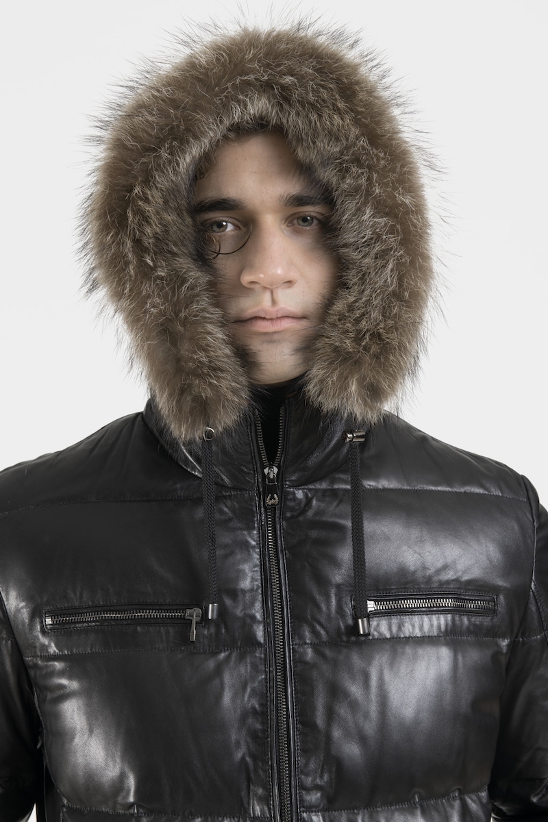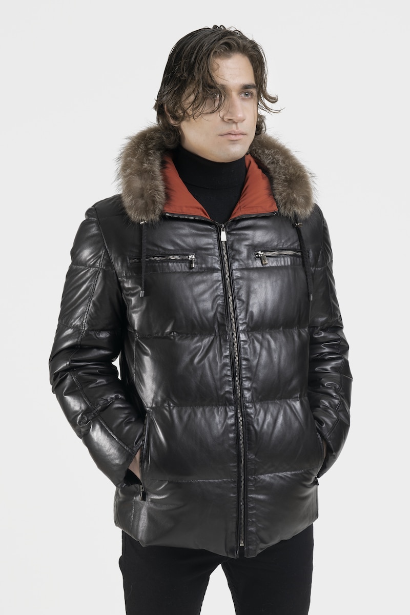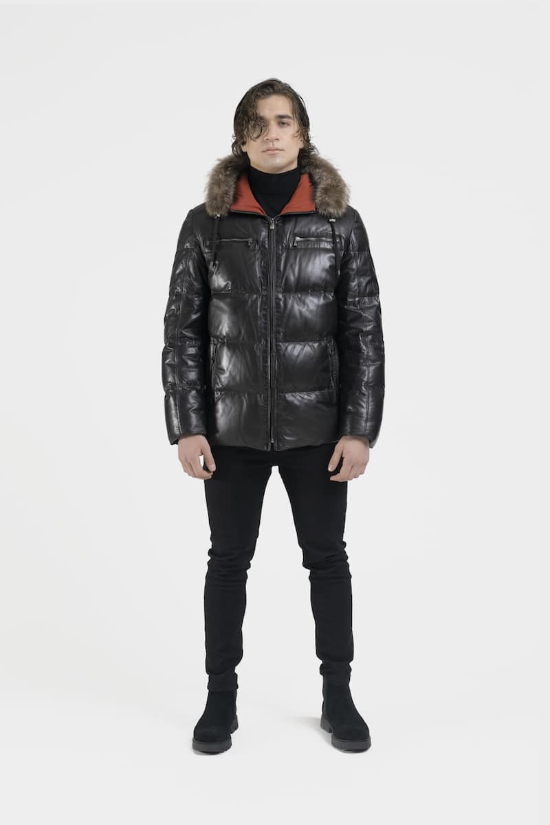Cette veste exclusive à capuchon en cuir d’agneau noir, présente une fermeture centrale éclair, deux poches latérales verticales, deux poches poitrines et deux poches intérieures. Le modèle Sisto allie un style sportif et affirmé avec une doublure rouge tranchante.