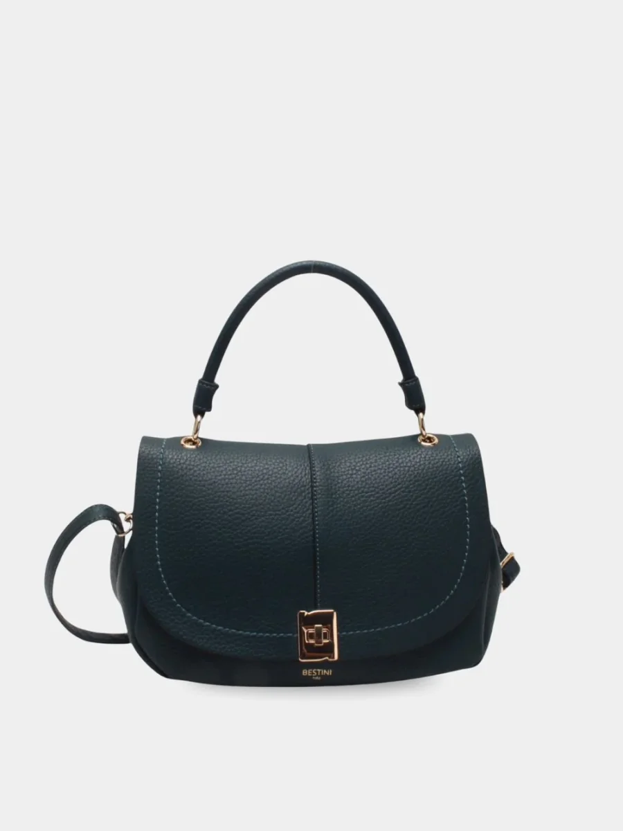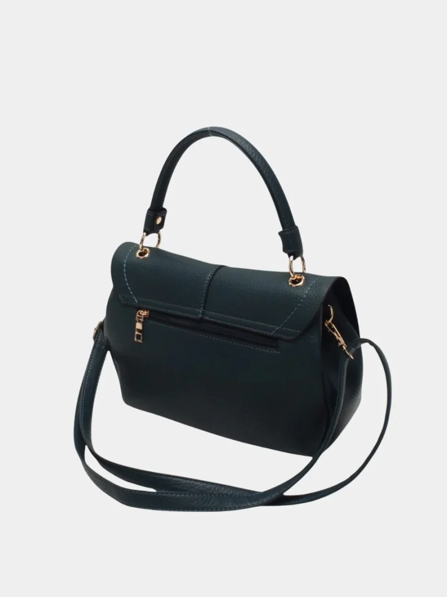 Sa silhouette arrondie est soulignée par un rabat généreux et une ligne centrale discrète. Les finitions métalliques et la poignée courte structurent l’ensemble tout en conservant une esthétique sobre.