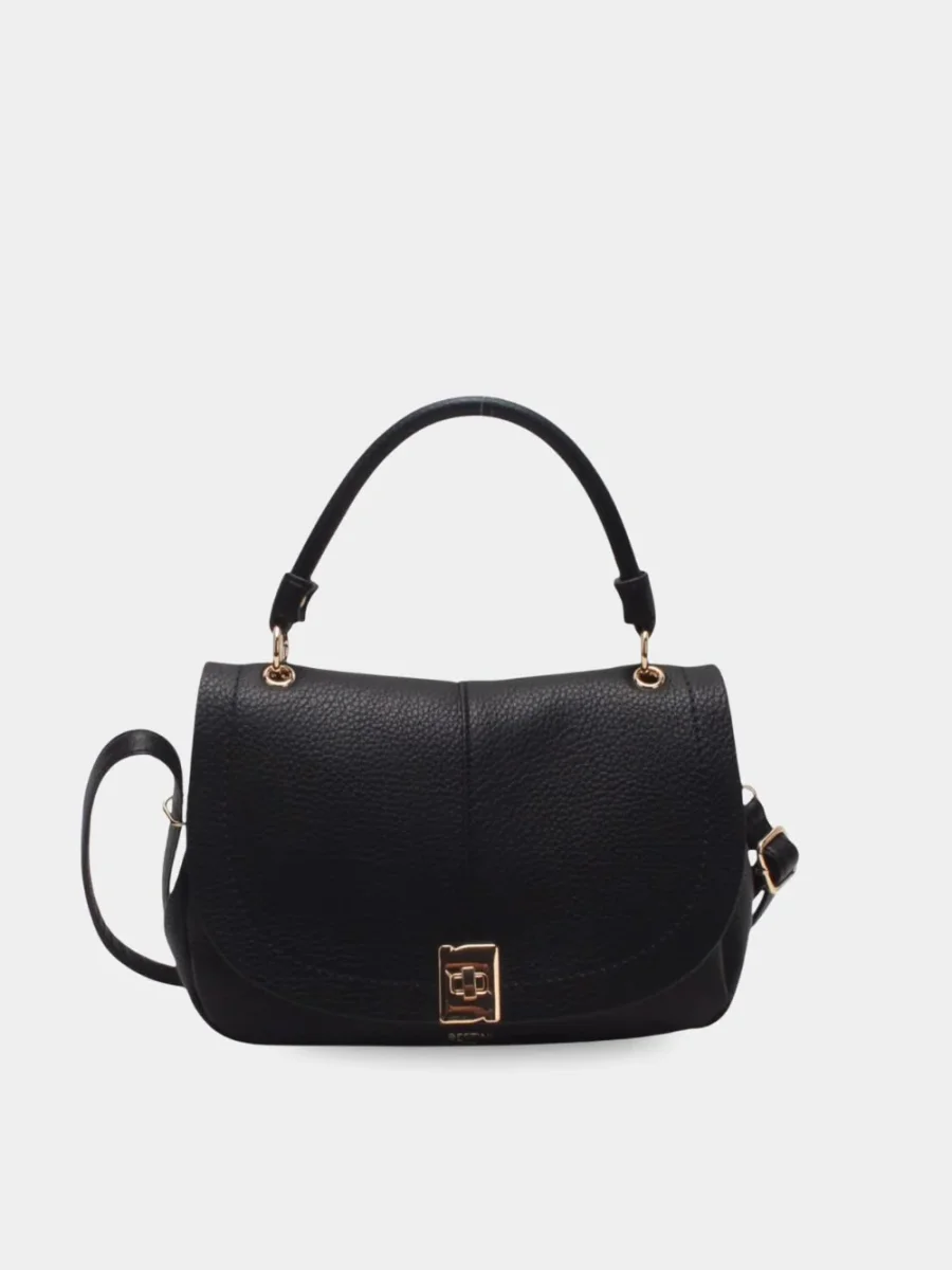 Sa silhouette arrondie est soulignée par un rabat généreux et une ligne centrale discrète. Les finitions métalliques et la poignée courte structurent l’ensemble tout en conservant une esthétique sobre.