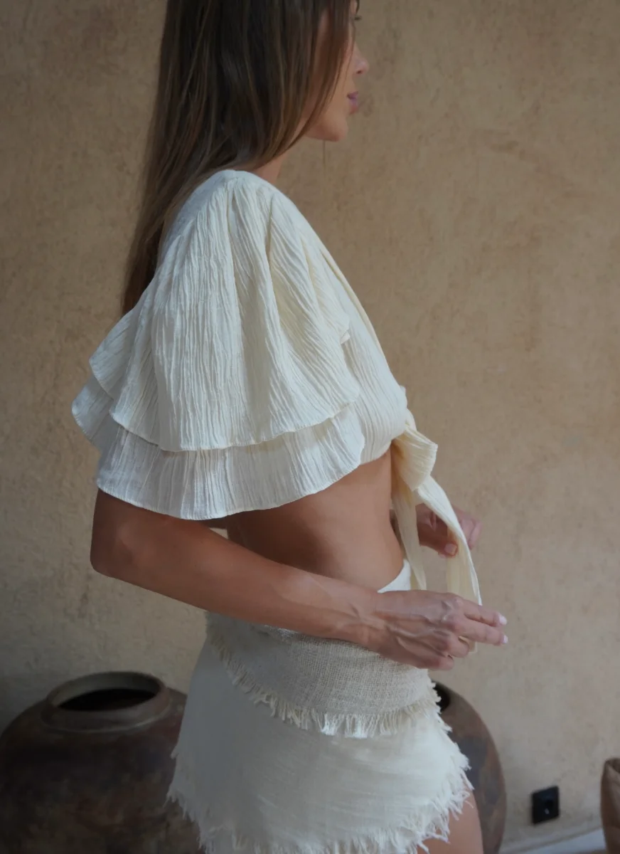 Avec ses manches volantées et son décolleté plongeant, le top Valeria sublime le buste avec une élégance naturelle et une touche d’impertinence. Son lien à nouer à l’avant permet un ajustement parfait, tout en soulignant délicatement la taille. Léger et aérien, il accompagne les journées ensoleillées comme les fins d’après-midi dorées. À enfiler sur un maillot ou associé à une jupe fluide, il devient l’allié des escapades au goût de liberté.