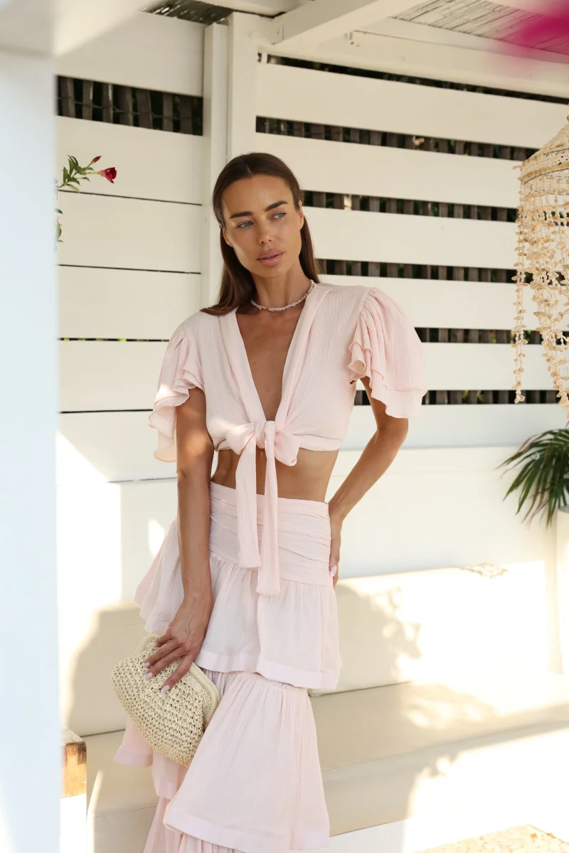Avec ses manches volantées et son décolleté plongeant, le top Valeria sublime le buste avec une élégance naturelle et une touche d’impertinence. Son lien à nouer à l’avant permet un ajustement parfait, tout en soulignant délicatement la taille. Léger et aérien, il accompagne les journées ensoleillées comme les fins d’après-midi dorées. À enfiler sur un maillot ou associé à une jupe fluide, il devient l’allié des escapades au goût de liberté.