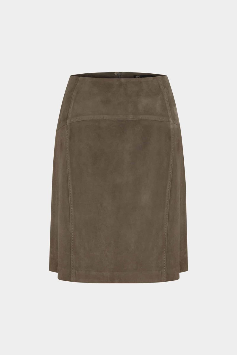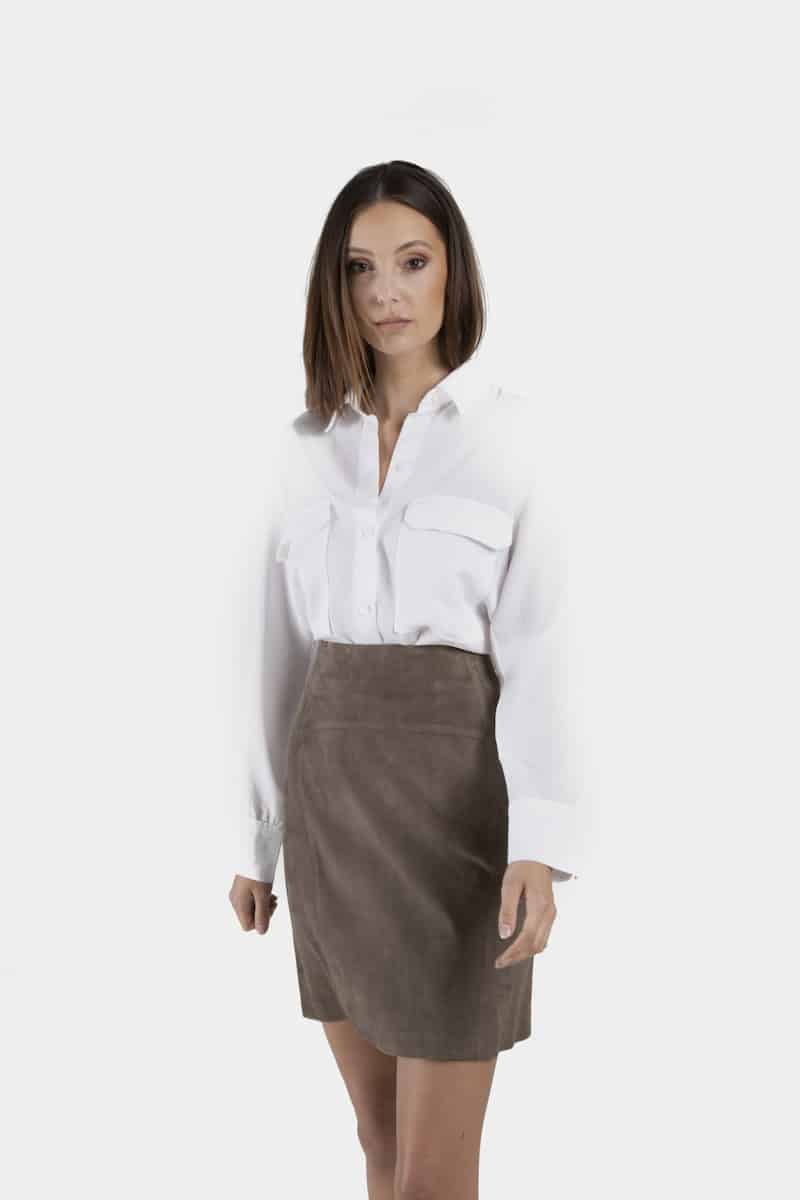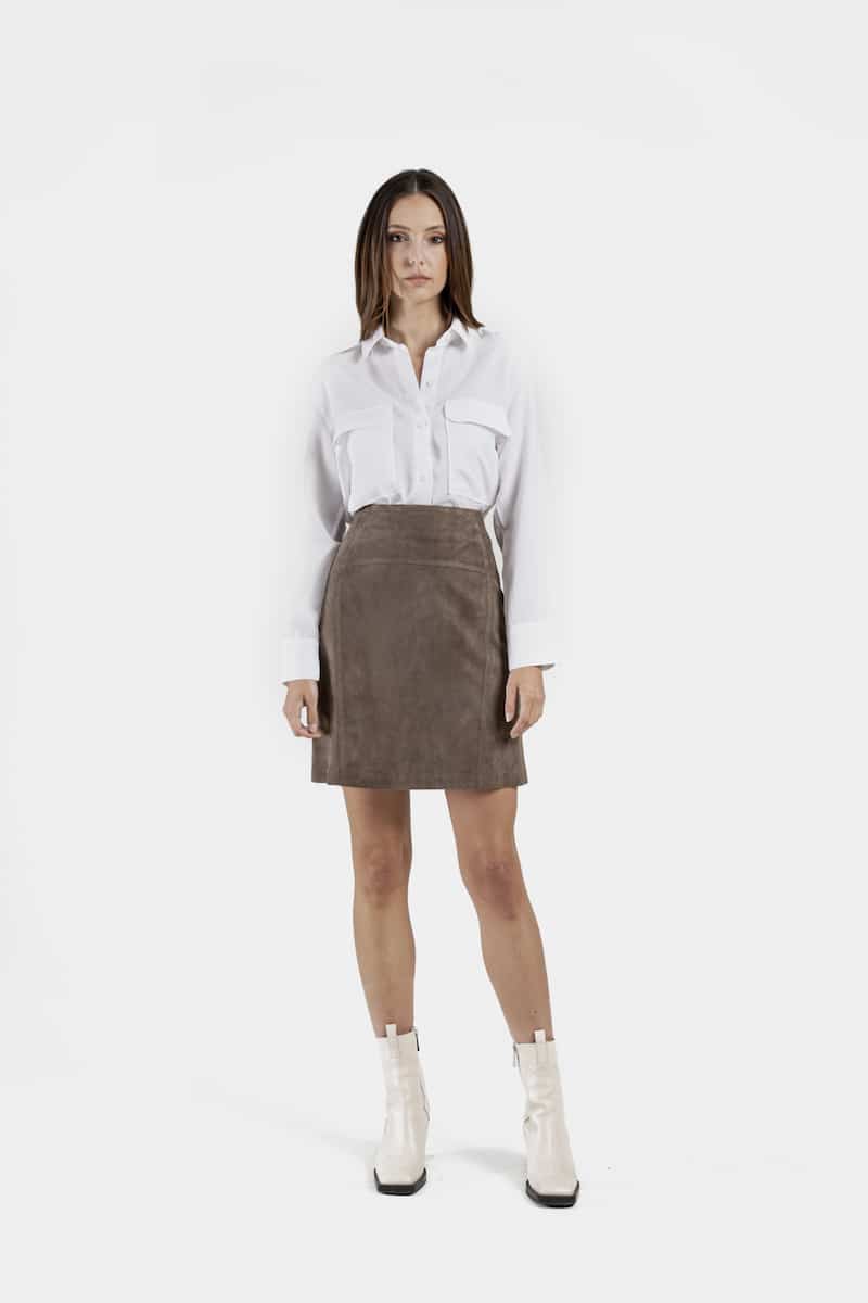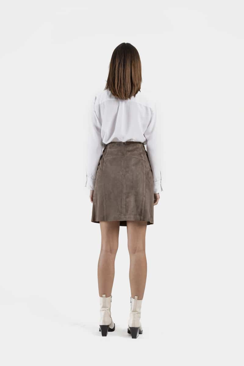 Inspirée des coupes des années 70, cette jupe courte et taille haute en daim chèvre velours gris taupe présente une coupe légèrement évasée et une fermeture éclair invisible dans le dos.