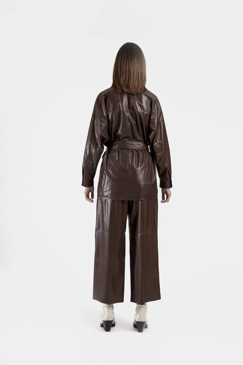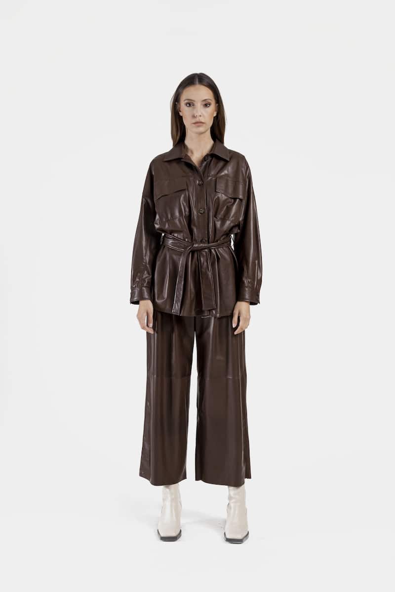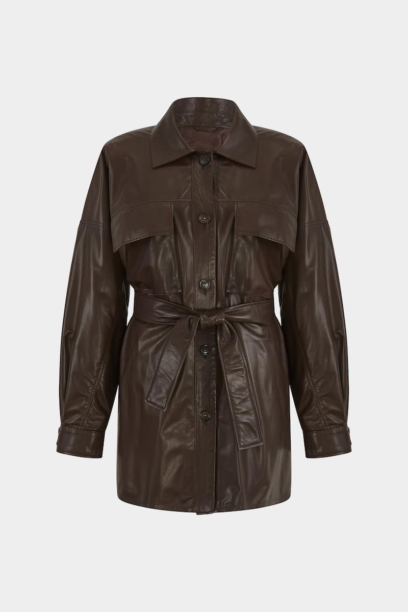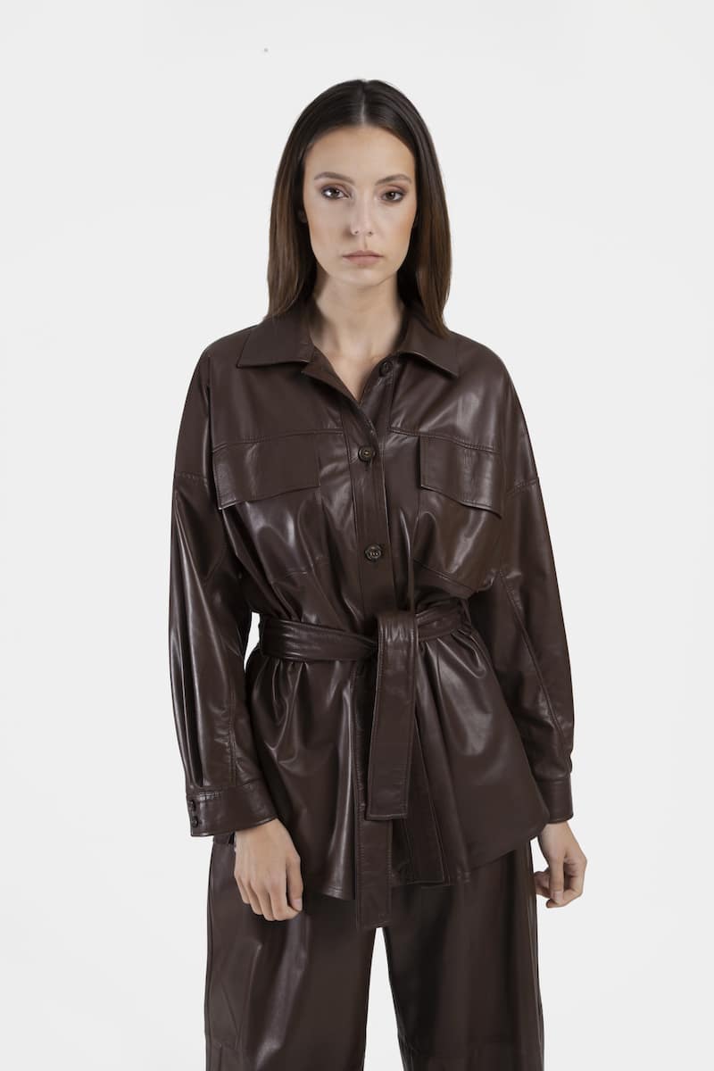 Cette veste chemise oversize en cuir d’agneau entrefinos marron présente une fermeture centrale à boutons cousus main, deux poches plaquées sur la poitrine et une ceinture à nouer au niveau de la taille. L’utilisation de cuir d’agneau plongé ultra fin procure au modèle VALIA légèreté et souplesse.