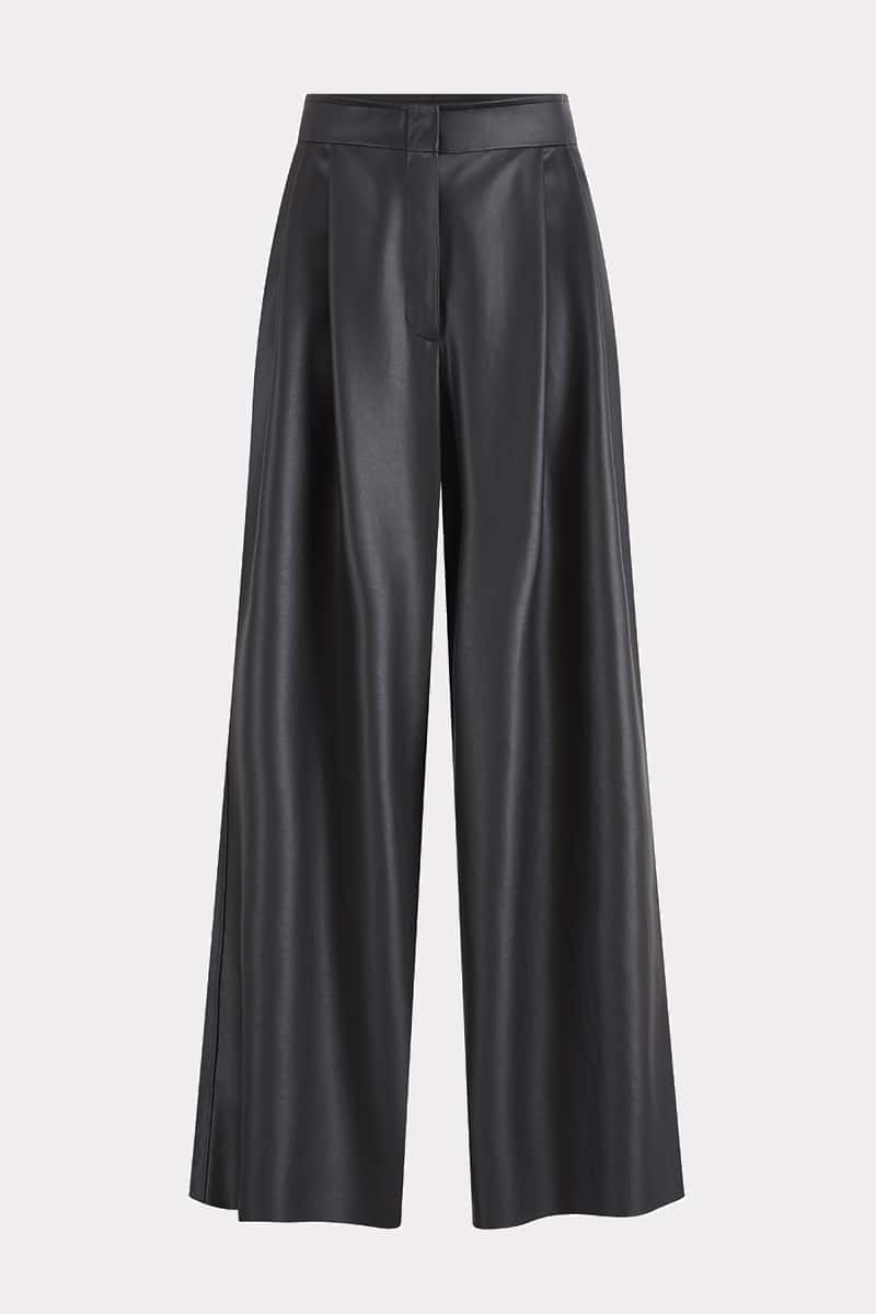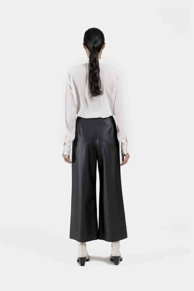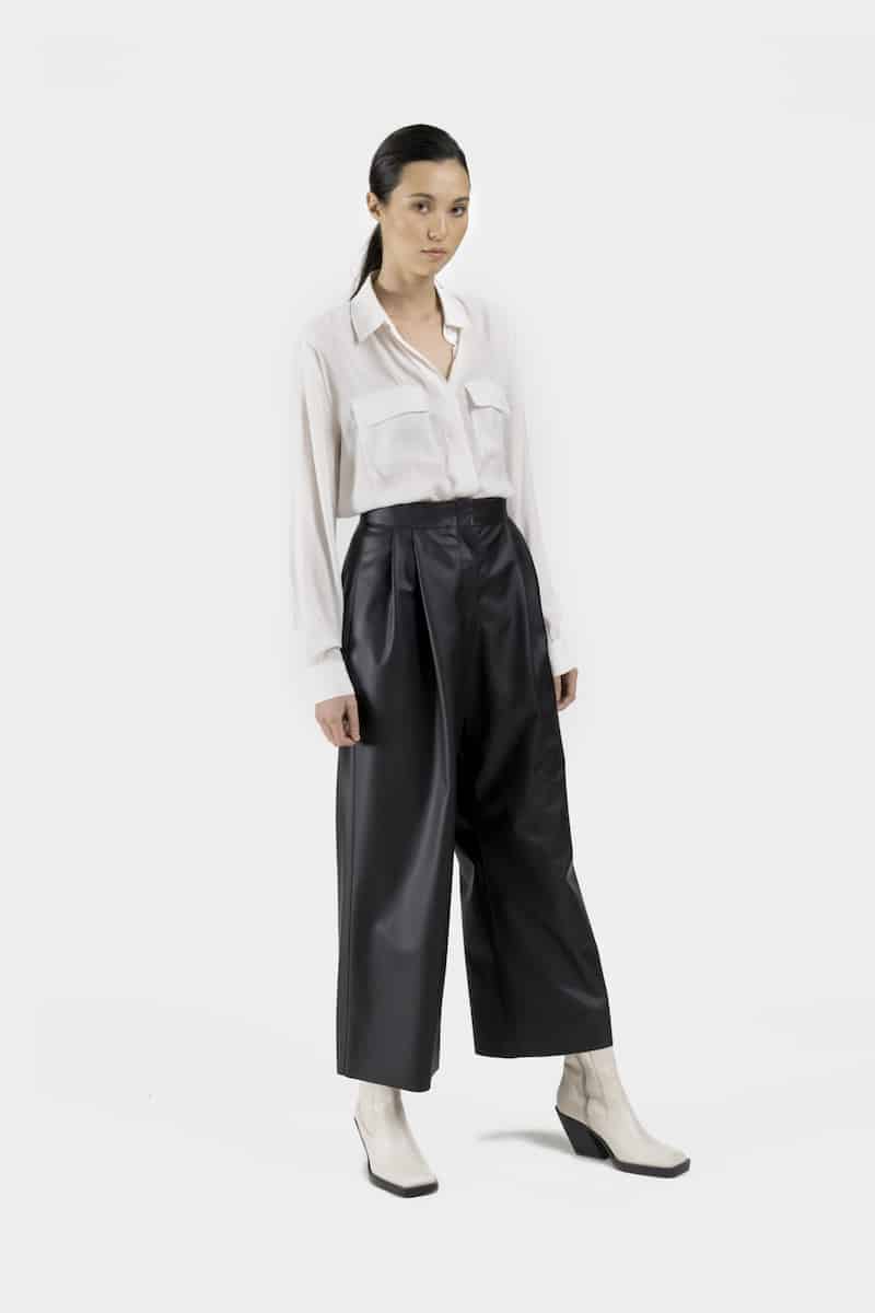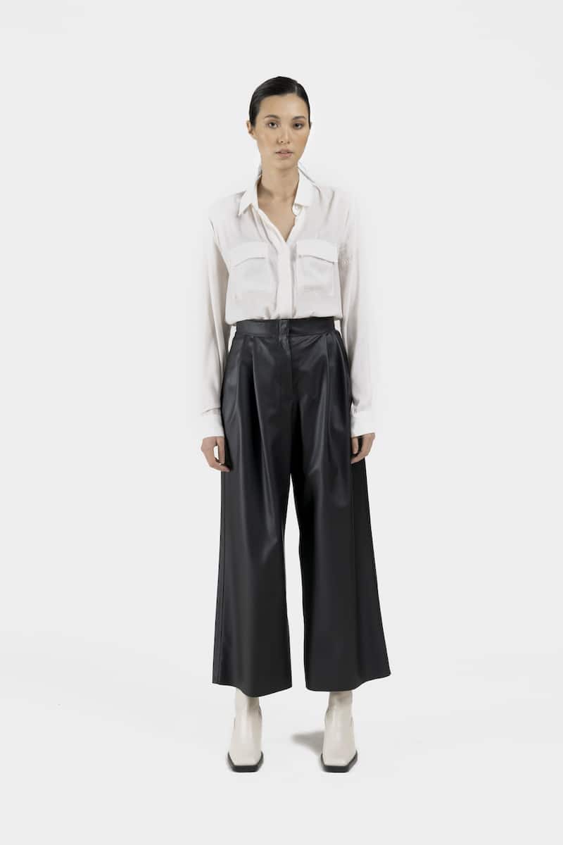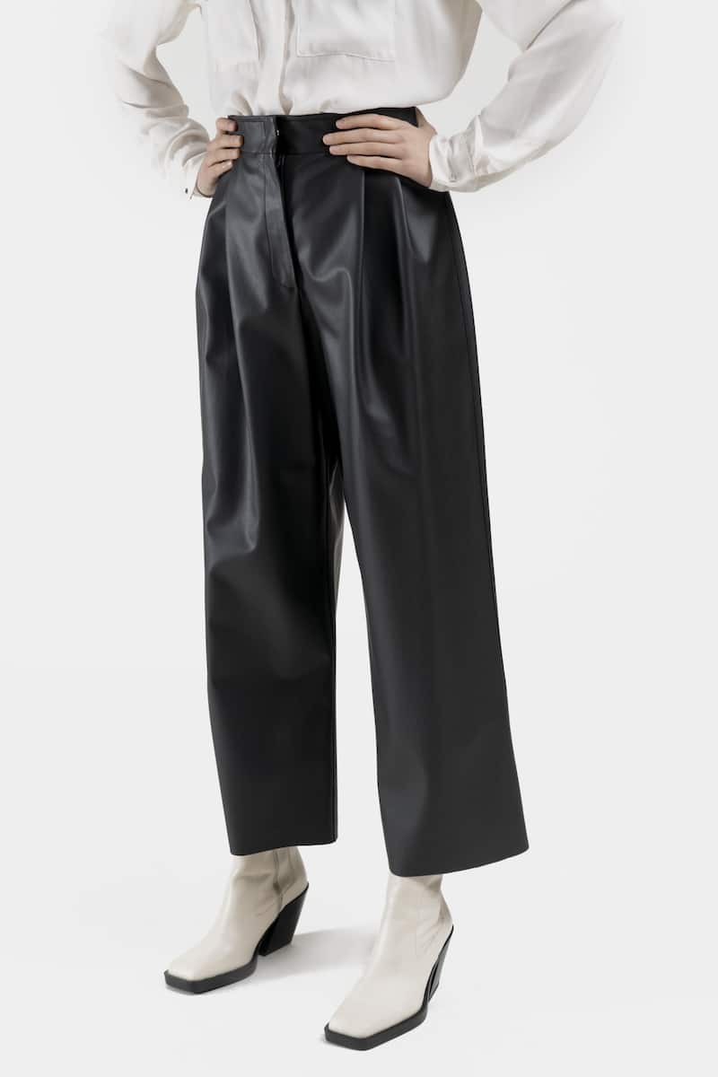 Ce large pantalon taille haute en cuir vegan de cactus noir présente une fermeture par pression invisible et deux doubles plis sur le devant.