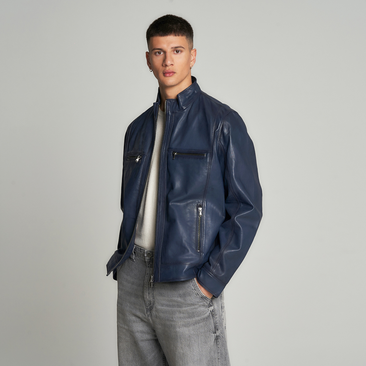 La veste en cuir pour homme Morrison en bleu marine est l’option idéale pour ceux qui désirent se démarquer avec subtilité et élégance. Confectionnée à partir de véritable cuir italien et soigneusement travaillée, elle arbore une teinte sombre raffinée qui apporte une touche contemporaine à un vêtement au design intemporel. La coupe est soignée tout en étant affirmée, dotée de quatre poches avant zippées en métal, d’une fermeture éclair centrale à double curseur et d’un col mao moderne. Les fermetures éclair aux poignets ajoutent une fonctionnalité supplémentaire, tandis que les coutures verticales épousent la silhouette du corps harmonieusement. Le bleu profond du cuir fait de Morrison une veste polyvalente, convenant aussi bien aux journées qu’aux soirées, parfaitement assortie aussi bien avec des jeans qu’avec des tenues plus habillées. Un article au caractère marqué mais raffiné, conçu pour l’homme contemporain cherchant à allier confort, qualité et style personnel. Fabriqué entièrement en Italie !