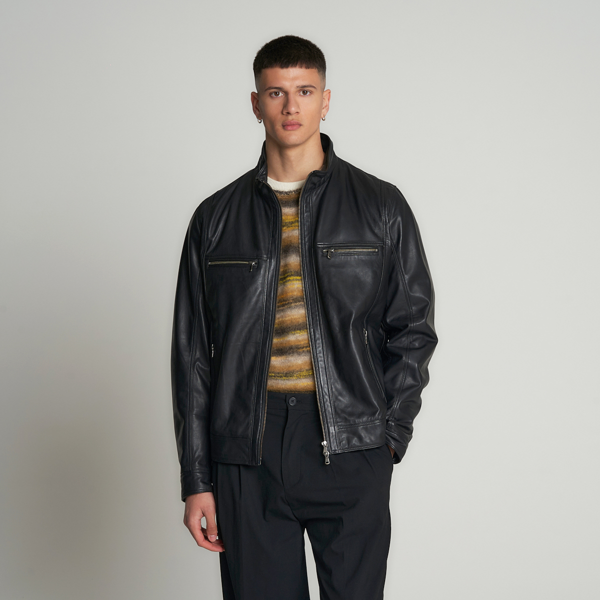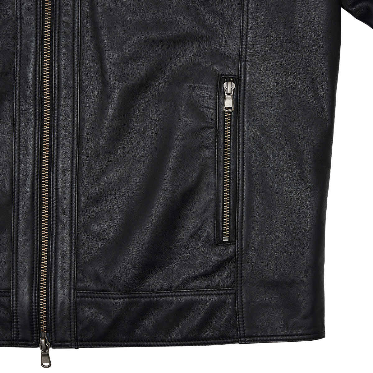 La veste en cuir Morrison rend hommage à l’attrait intemporel du style biker, revisité avec élégance et minutie. Confectionnée en véritable cuir noir de haute qualité, elle propose une coupe moderne et polyvalente, idéale pour parfaire des tenues décontractées ou apporter du caractère à un look plus raffiné. Équipée de quatre poches zippées en métal – deux sur la poitrine et deux sur les côtés – ainsi que d’une fermeture frontale à double curseur et d’un col chinois orné d’un détail rouge intérieur, Morrison allie fonctionnalité et esthétique urbaine dans une seule pièce. Les coutures accentuées et la coupe structurée mettent en valeur la silhouette masculine, tandis que le cuir souple garantit confort et longévité. Parfaite pour ceux qui recherchent une veste en cuir au tempérament affirmé, adaptée à un usage quotidien.