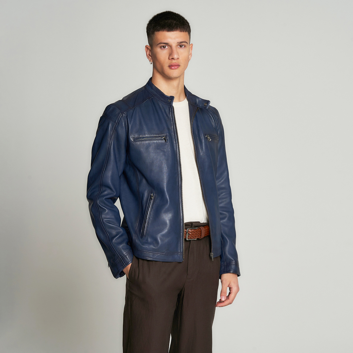 Dans la variante bleu marine, Silverstone se présente sous un jour frais, contemporain et raffiné. La couleur, à la fois intense et discrète, apporte une touche d’originalité au traditionnel blouson en cuir tout en conservant rigueur et praticité. Le cuir italien, travaillé selon des méthodes artisanales, affiche une finition satinée qui souligne l’excellence de la matière première. Équipé de quatre poches zippées pratiques et d’une fermeture frontale en métal, ce modèle allie confort, fonctionnalité et une silhouette affirmée. Parfait pour ceux qui recherchent une veste élégante mais moins conventionnelle, il s’accorde aussi bien avec du denim qu’avec des pantalons plus habillés. Un choix empreint de personnalité, signé par le savoir-faire artisanal italien.