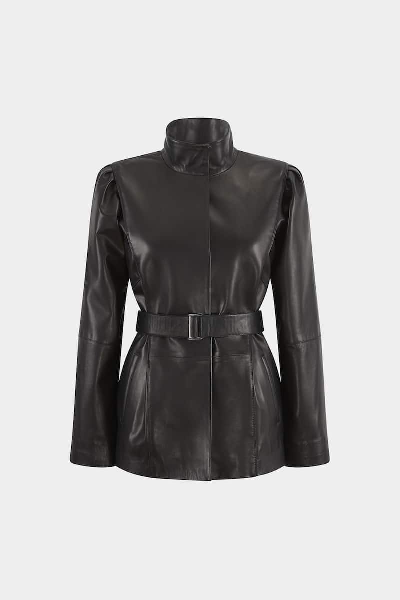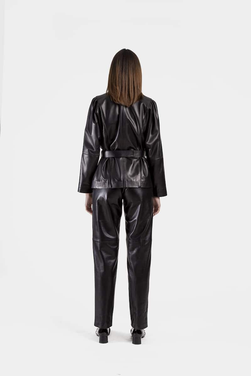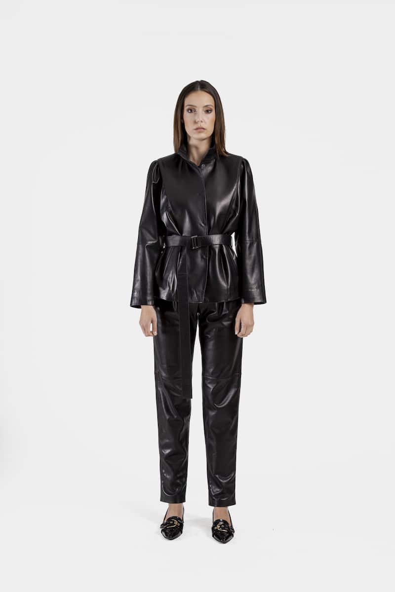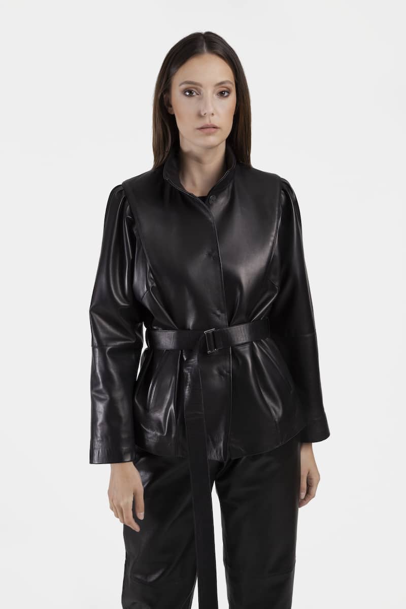 Courte veste avec ceinture en cuir d’agneau plongé noir. VOLGA présente une fermeture centrale à pressions cousues main, un col montant et deux poches latérales. Cette veste présente également des manches chauve-souris ainsi qu’un travail de pli sur les épaules, procurant une aisance dans le mouvement.